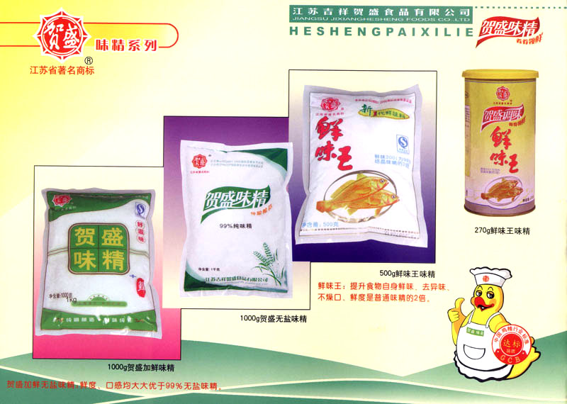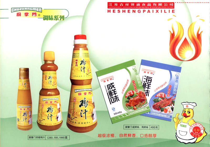 江蘇吉祥賀盛食品有限公司是一家中國專業(yè)餐料知名制造商,公司座落在經(jīng)濟高度發(fā)達(dá)“長三角”的常州市,緊靠312國道,滬寧高速與沿江高速交匯處,距常州火車站及長江水運碼頭20千米,交通十分便利。公司占地面積23500平方米,花園式工廠、廠房面積18500平方米,現(xiàn)在員工330余名,其中擁有中、高級職稱管理和技術(shù)人員58名,生產(chǎn)場地均按食品和藥品GMP要求設(shè)計、全封閉車間、中央空調(diào)系統(tǒng)、閉路電視監(jiān)控系統(tǒng)。目前已建成成三條雞精,雞粉生產(chǎn)線。一條雞汁生產(chǎn)線。一條鮮味汁生產(chǎn)線。一條醬汁精膏類生產(chǎn)線,規(guī)劃年生產(chǎn)能力達(dá)30000噸。 “賀盛”品牌取自《詩·大雅·下武》中“受天之祜、 四方來賀”;《易經(jīng)》中“富有謂之大業(yè),日新之謂盛德”,賀盛企業(yè)師法源遠(yuǎn)流長中華飲食文化,融匯中西健康美食調(diào)味。相繼研發(fā)生產(chǎn)出高品質(zhì)的“賀盛牌”味精、雞精、雞粉、雞汁、湯王、鮑魚醬王、鮮味汁調(diào)味素和各種風(fēng)味熱反應(yīng)精膏等系列產(chǎn)品。二十年來“賀盛”產(chǎn)品質(zhì)量獲得廚藝界專業(yè)人士和消費者的一致好評和高度認(rèn)可。 賀盛企業(yè)和產(chǎn)品相繼榮獲1995年“首界中國國際食品博覽會金獎”,2001年企業(yè)通過ISO-9001國際質(zhì)量體系認(rèn)證,2003年江蘇省“計量保證確認(rèn)單位”,2004年獲得自營出口權(quán),2005年賀盛雞精榮獲“江蘇名牌產(chǎn)品”,2006年賀盛商標(biāo)被評為“江蘇省著名商標(biāo)”,2007年通過HACCP認(rèn)證,全部產(chǎn)品均通過QS食品安全認(rèn)證,并積極努力爭創(chuàng)中國名牌,中國馳名商標(biāo)。 公司銷售網(wǎng)點建設(shè)發(fā)展迅速,相繼組建上海、南京、河南、海南、新疆全資分公司;辦事處、經(jīng)銷商覆蓋全國,并出口日本、香港及東南亞地區(qū)。二十年來,在公司總裁周國林先生帶領(lǐng)下,全體同仁秉承“厚德載物、自強不息”宗旨,發(fā)揚“以人為本、科技創(chuàng)新、自我加壓、爭創(chuàng)一流”的企求精神;致力于傳承中華飲食文化,融化西方美食精粹,不斷的研發(fā)、創(chuàng)新,奉獻更多更好的調(diào)味料,讓生活更有滋味。公司總裁周國林先生攜全體員工熱誠歡迎各位新老朋友蒞臨指導(dǎo),洽談合作!