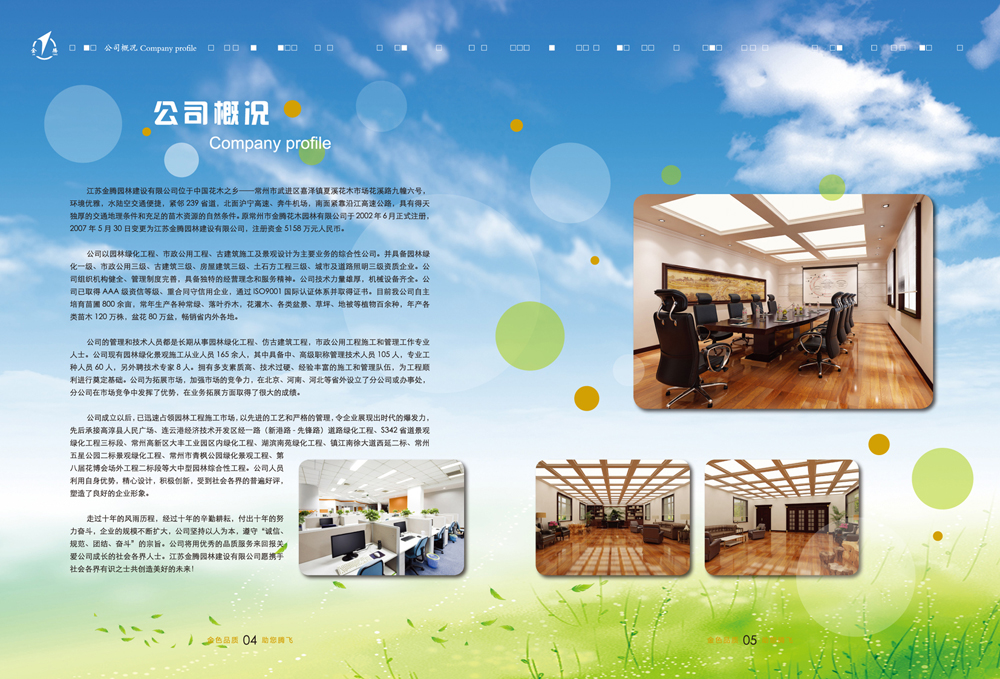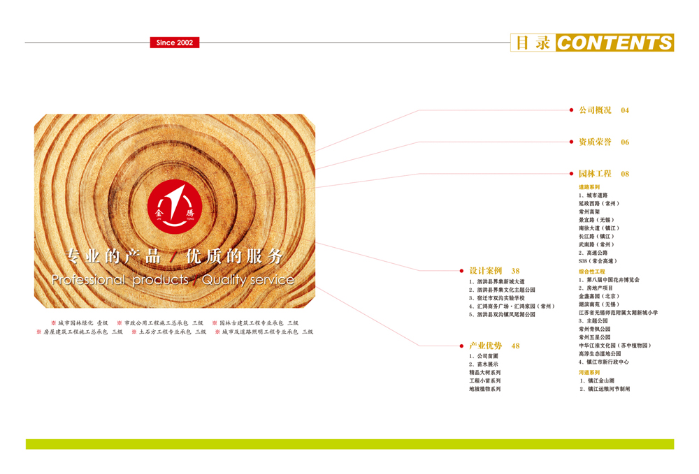 公司以園林綠化工程、市政公用工程、古建筑施工及景觀設(shè)計(jì)為主要業(yè)務(wù)的綜合性公司。并具備園林綠化一級、市政公用二級、鋼結(jié)構(gòu)三級、古建筑三級、房屋建筑工程施工總承包三級和城市及道路照明工程專業(yè)承包三級資質(zhì)企業(yè)。公司組織機(jī)構(gòu)健全、管理制度完善,具備獨(dú)特的經(jīng)營理念和服務(wù)精神。公司技術(shù)力量雄厚,機(jī)械設(shè)備齊全。公司已取得AAA級資信等級、重合同守信用企業(yè),通過ISO9001國際認(rèn)證體系并取得證書。目前我公司自主培育苗圃1000余畝,常年生產(chǎn)各種常綠、落葉喬木,花灌木、各類盆景、草坪、地被等植物百余種,年產(chǎn)各類苗木250萬株,盆花130萬盆,暢銷省內(nèi)外各地。