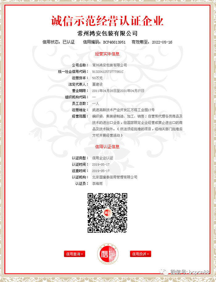 常州鴻安包裝有限公司是專業(yè)集裝袋的生產廠家,F(xiàn)有職工100人,專業(yè)技術人員20人,我廠擁有先進的全套生產設備,還具備保證產品質量的全套測試方法及設備,年產量60萬條。我廠依托科技興廠注重技術革新在引進先進的設備同時吸收各類高級技師充實生產第一線,生產的各類規(guī)格的集裝袋以出口為主。