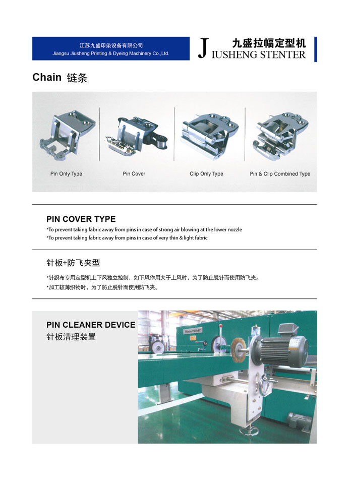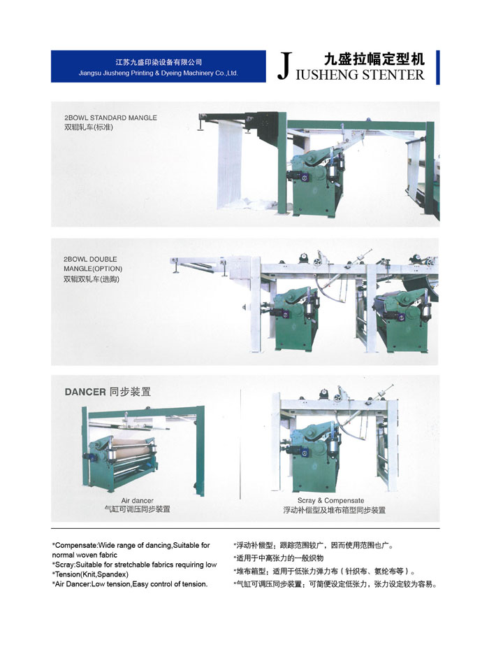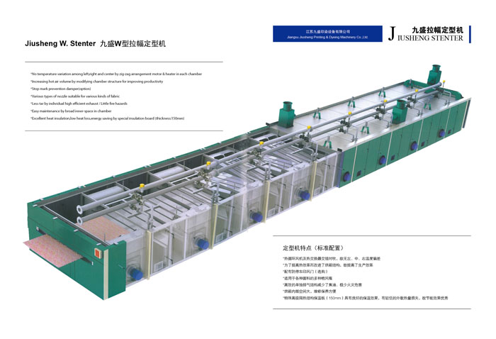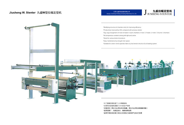 江蘇九盛印染設(shè)備有限公司(原江蘇鵬輝印染機(jī)械有限公司)創(chuàng)建于1986年,北長(zhǎng)江,所在地區(qū)內(nèi)鐵路、高等級(jí)公路縱橫成網(wǎng),常州長(zhǎng)江公路大橋飛架大江南北,水陸交通十分便利。公司有近二十年的熱定型機(jī)設(shè)計(jì)、生產(chǎn)經(jīng)驗(yàn)、有批從事新型熱定機(jī)開(kāi)發(fā)、設(shè)計(jì)的專業(yè)人才,具有豐富生產(chǎn)和制作經(jīng)驗(yàn)的技師和技工。已成為國(guó)內(nèi)頗具名聲的機(jī)械制作企業(yè)。 樹(shù)脂定型是染整工程最后的程序,因此定型機(jī)的設(shè)計(jì)及操作技術(shù)成為決定織物品質(zhì)重要的一環(huán),九盛公司多年的經(jīng)驗(yàn)改良完成新生代定型機(jī),針對(duì)業(yè)者需要對(duì)于節(jié)省人力布匹張力的減少、緯紗的調(diào)整,風(fēng)量的調(diào)節(jié),布邊控制及切邊損耗及至于熱能保持,維修工作,操作管理都有卓越表現(xiàn)及實(shí)際成果,而機(jī)械的研制及生產(chǎn)技術(shù)的發(fā)展是本公司創(chuàng)立的目標(biāo)和宗旨。