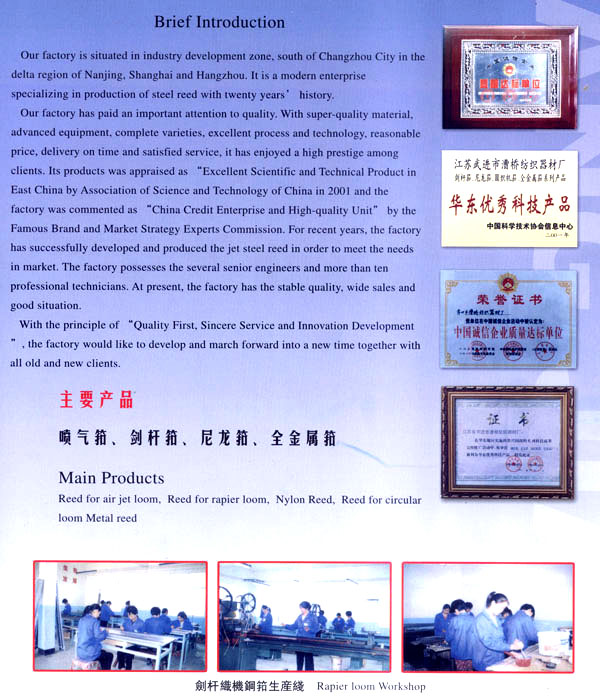 漕橋紡織器材廠位于常州市南郊寧、滬、杭金三角漕橋工業(yè)開(kāi)發(fā)區(qū),是全國(guó)專(zhuān)業(yè)生產(chǎn)鋼筘規(guī)模較大的現(xiàn)代化廠家,已具有20年的歷史。 本廠生產(chǎn)的鋼筘有噴氣、劍桿筘、尼龍?bào)、圓織機(jī)筘和金屬筘分鉸筘、織帶筘、無(wú)梭織帶筘……本廠特別擅長(zhǎng)生產(chǎn)高密度的劍桿筘。 本廠素以質(zhì)量為重,均采用優(yōu)質(zhì)材料制筘,如噴氣筘使用的筘片膠水鋁架等,均采用日本進(jìn)口的材料;劍桿筘筘片采用日本進(jìn)口的57B線(xiàn)材,膠水均采用紡織部定點(diǎn)的陜西紡織研究所生產(chǎn)的優(yōu)質(zhì)膠水、高密度劍桿筘均用進(jìn)口膠水制筘;全金屬筘均用云南的優(yōu)質(zhì)錫制筘。 各種鋼筘筘面的平整度,筘齒的均勻度、垂直度,筘片的彈性度,膠水的牢固度廣大用戶(hù)使用后感到滿(mǎn)意放心,特別是使用壽命特別長(zhǎng),受到用戶(hù)一致的盛贊,真是料好筘好,筘好布好。 本廠為了使質(zhì)量精益求精,增添了不少先進(jìn)設(shè)備,并聘請(qǐng)了數(shù)名高級(jí)工程師和十多位具有專(zhuān)業(yè)知識(shí)的技術(shù)人員把關(guān)。由于質(zhì)量穩(wěn)定可靠,2001年被中國(guó)科學(xué)技術(shù)協(xié)會(huì)評(píng)為“華東優(yōu)秀科技產(chǎn)品”二00二年被中國(guó)管理科學(xué)研究院名牌與市場(chǎng)戰(zhàn)略專(zhuān)家委員會(huì)評(píng)為“中國(guó)誠(chéng)信企業(yè)質(zhì)量達(dá)標(biāo)單位”。 今本廠產(chǎn)品暢銷(xiāo)全國(guó)20多個(gè)省市,價(jià)格優(yōu)惠,供不應(yīng)求,形勢(shì)喜人。 本廠本著“以質(zhì)取勝、誠(chéng)信服務(wù)、創(chuàng)新發(fā)展”的宗旨,愿與廣大新老客戶(hù)攜手共肩,昂首走進(jìn)新時(shí)代,迎接新的挑戰(zhàn)。