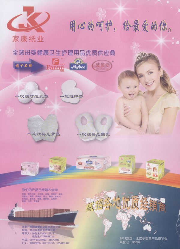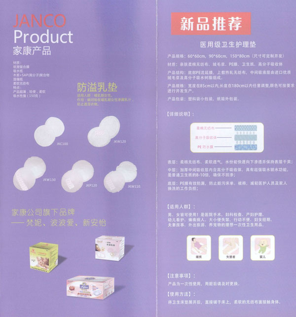 中國(guó)(JANCO)家康衛(wèi)生用品公司成立于2004年,我們專(zhuān)注于研發(fā)、設(shè)計(jì)、及制造健康的衛(wèi)生用品。我們的產(chǎn)品包括防溢乳墊、汗墊、寶寶背墊、圍兜、護(hù)理墊等。我們的生產(chǎn)廠(chǎng)房建設(shè)在中國(guó)江蘇省常州市,這是一個(gè)非常美麗的城市,并且我們的廠(chǎng)區(qū)鄰近沿江高速,交通非常便利。 我們擁有國(guó)際一流的生產(chǎn)設(shè)備、先進(jìn)的檢測(cè)儀器、無(wú)菌的生產(chǎn)車(chē)間。我們每一個(gè)產(chǎn)品都經(jīng)過(guò)家康人專(zhuān)心、專(zhuān)業(yè)的制造,我們注重每一個(gè)細(xì)節(jié),不斷的研發(fā)更舒適、更健康、更人性化的產(chǎn)品,旨在為您提供更滿(mǎn)意的服務(wù)。我們也可以根據(jù)您的需求研發(fā)、設(shè)計(jì)、生產(chǎn)不同的產(chǎn)品。我們的產(chǎn)品已遠(yuǎn)銷(xiāo)海外,并且得到非常好的評(píng)價(jià)。出口的國(guó)家有美國(guó)、加拿大、英國(guó)、意大利、俄羅斯、南非、泰國(guó)等。人性化的設(shè)計(jì)、優(yōu)秀的品質(zhì)、完善的售前、售后服務(wù)及合理的價(jià)格使我們的客戶(hù)與我們的合作感到非常的愉快。 我們已經(jīng)通過(guò)了ISO9000和FDA認(rèn)證,我們將感到非常榮幸能夠與您合作。 我們非常樂(lè)意與中國(guó)的經(jīng)銷(xiāo)商共同分享我們的產(chǎn)品,我們將非常期待您的信任和加盟。 我們將一如既往的為您提供:更舒適的、更健康的產(chǎn)品。