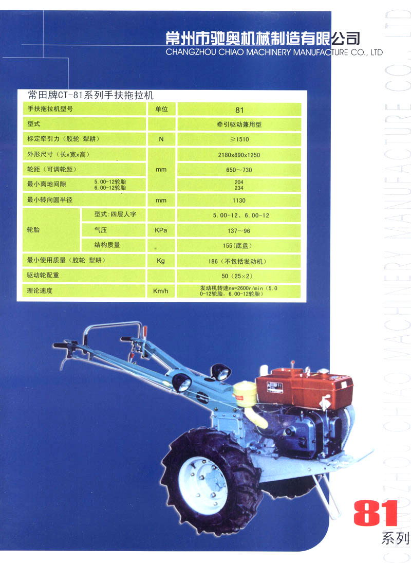 常州市馳奧機(jī)械制造有限公司是生產(chǎn)手扶拖拉機(jī)的專業(yè)生產(chǎn)企業(yè),公司位于風(fēng)景秀麗、人文薈萃的江蘇省常州市,緊鄰滬寧、寧常高速以及312國道,交通極為便利。公司擁有先進(jìn)的手扶拖拉機(jī)生產(chǎn)線,主要生產(chǎn)81/91,121/151型手扶拖拉機(jī),產(chǎn)品均為國家農(nóng)機(jī)購置補(bǔ)貼產(chǎn)品。 公司堅(jiān)持以科技興企業(yè),在提高產(chǎn)品技術(shù)含量的同時(shí),加強(qiáng)產(chǎn)品質(zhì)量、售后服務(wù)方面的監(jiān)督與管理,根據(jù)市場需求提升改進(jìn)和研發(fā)新產(chǎn)品,使公司產(chǎn)品得到了市場的認(rèn)可,贏得了廣大農(nóng)民用戶的一致好評(píng)。 公司將本著“誠信經(jīng)營、質(zhì)量第一、客戶至上”的經(jīng)營理念,立足現(xiàn)在、著眼未來,以打造常州一流的農(nóng)機(jī)品牌為目標(biāo),在提升產(chǎn)品技術(shù)、保障產(chǎn)品質(zhì)量的同時(shí),不斷研發(fā)新產(chǎn)品,最大程度的滿足用戶需求,為我國農(nóng)業(yè)機(jī)械現(xiàn)代化發(fā)展做出應(yīng)有的貢獻(xiàn)!
