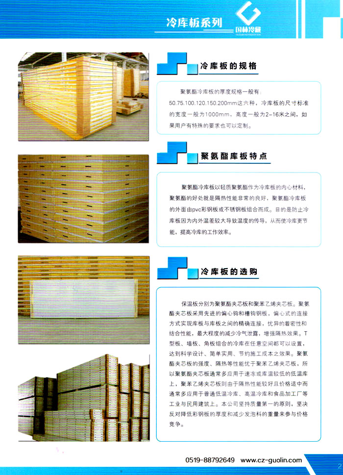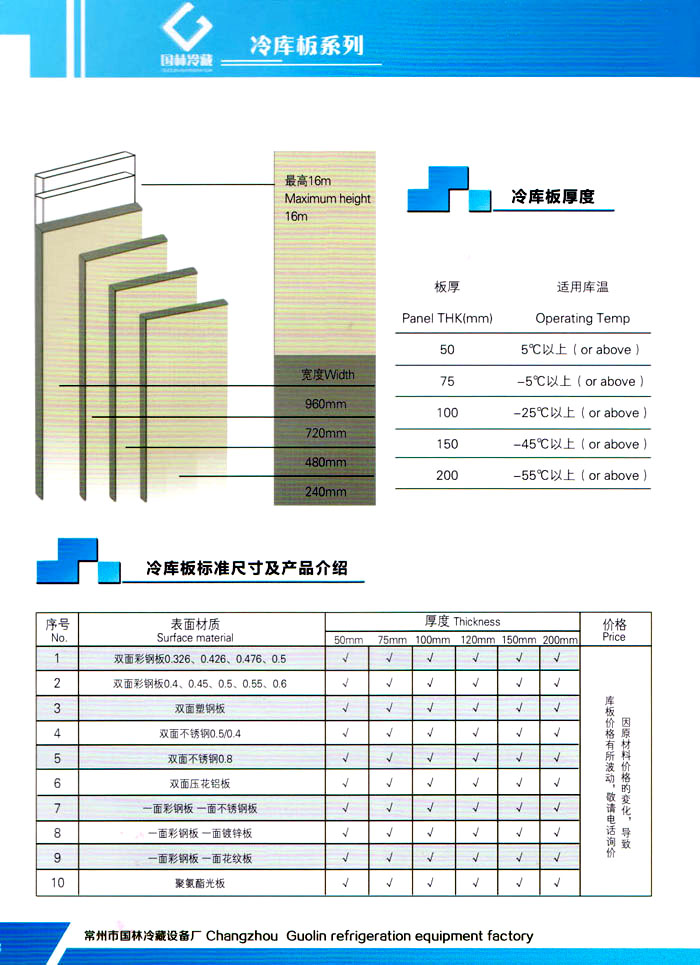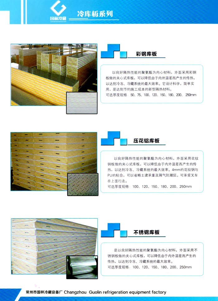 常州市國林冷藏設備廠(原武進長虹冷藏設備廠)成立于1995年,地處江南水鄉(xiāng)中國富饒的“長江三角洲”中心區(qū)域—江蘇常州,滬寧高速、沿江高速、312國道,交通快捷,即刻到達。 國林冷庫:公司通過了ISO9001:2000質量體系認證,國林冷庫多次獲得“江蘇省優(yōu)質產品”稱號,全國質量服務AAAAA示范單位,并且是中國食品網、阿里巴巴,空調制冷誠信通會員企業(yè),并與全國多家設計院技術合作,本廠的誠信服務獲得了廣大客戶的認可。 國林冷庫:中國制冷行業(yè)的十大冷庫制造商之一,中國制冷重要工業(yè)生產基地。本公司***生產保溫庫板及冷庫制冷成套設備,庫板材料涉及不銹鋼、彩鋼板、玻璃鋼板、保溫聚氨脂板。年產量3000多臺,庫板30多萬平方,歡迎新好客戶前來訂購。 國林制冷:公司始終堅持:“質量為上,追求品質”的生產方針;始終信奉:“客戶為先,服務為本”的經營理念。我們愿同廣大的新老客戶在新的世紀里,共同發(fā)展,利益雙贏,再創(chuàng)輝煌。 常州市國林冷藏設備廠***生產7.5公分,10公分,12公分,15公分,20公分的聚氨酯冷庫板,面板包括彩鋼板、不銹鋼板、壓花鋁板等各種板材,各種冷庫半埋門及平移動門,各種鐵排管和鋁排管,價格優(yōu)惠,有需要的可以聯系我金文燁18761183807