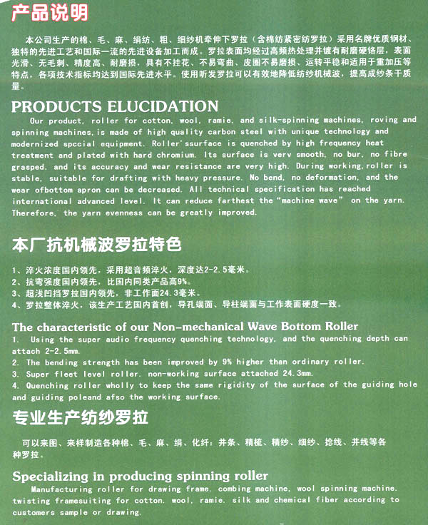 我公司于1998年成立常州進熙羅拉廠,經(jīng)過十年多的經(jīng)營,于2011年另成立常州聽發(fā)機械配件有限公司,現(xiàn)位于夏城路,靠近湖塘紡織城。 本公司產(chǎn)值從公司成立起從2010年350萬逐步提交至2011年的500萬,2012年有望達到1000萬。主要客戶,河南中原油田,湯姆機械,上海中行汽保,上海第一紡機廠,岡熱機械(常州)。 產(chǎn)品科類:紡機配件,抽油桿防磨扶正器,各種精密機械加工。 技術(shù)能力:本公司有6136數(shù)控7臺,6146數(shù)控1臺,6150數(shù)控1臺,進口斜床身1臺,立式加工中心4臺,有專職校車師傅2名,質(zhì)量巡檢,檢驗員各1名。 為了擴大生產(chǎn)能力,本公司可能于近年內(nèi)搬遷至更大廠區(qū),尋求更大更高的發(fā)展空間。