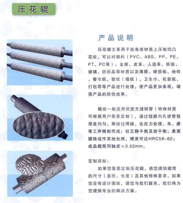 常州市武進(jìn)區(qū)禮嘉鎮(zhèn)萬(wàn)超機(jī)械有限公司專(zhuān)業(yè)生產(chǎn)、加工花輥、鏡面輥、無(wú)紡布設(shè)備,及各類(lèi)機(jī)械配件。產(chǎn)品廣泛應(yīng)用于金屬、塑料、皮革、紙張、玻璃、木材、無(wú)紡布、衛(wèi)生材料、包裝裝潢等行業(yè)。 公司經(jīng)營(yíng)方針:服務(wù)鍥而不舍 品質(zhì)力臻卓越。得到國(guó)內(nèi)眾多客戶(hù)的厚愛(ài)與好評(píng)。 歡迎各界朋友蒞臨常州萬(wàn)超機(jī)械有限公司指導(dǎo)和業(yè)務(wù)洽談。 萬(wàn)超為顧客免費(fèi)打樣、并代客壓紋!