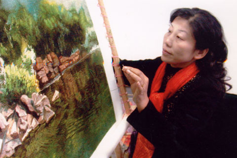 狄靜簡介: 狄靜現(xiàn)為江蘇省工藝美術(shù)大師,江蘇省非物質(zhì)文化遺產(chǎn)傳承人,研究員級高級工藝美術(shù)師,常州工藝美術(shù)家協(xié)會副主席兼秘書長,常州工藝美術(shù)行業(yè)協(xié)會副會長,1995年被聯(lián)合國教科文組織授予“民間工藝美術(shù)家”稱號。狄靜七十年代進常州市工藝美術(shù)研究所從事亂針繡藝術(shù)工作,曾受亂針繡創(chuàng)始人楊守玉先生親自指導(dǎo)和教誨。她從一名學(xué)員逐步走上了常州市工藝美術(shù)研究所亂針繡研究室主任,副所長、所長的崗位。 多年來,狄靜獨立完成的作品獲得了諸多榮譽: 1993年《鄧小平》入選第一屆工藝美術(shù)名家作品展, 1995年被聯(lián)合國教科文組織授予“民間工藝美術(shù)家”稱號, 1997年受新加坡政府邀請,進行為期一個月的文化藝術(shù)交流, 2000年《可愛的小鳥》榮獲第二屆中國工藝美術(shù)大師精品展的銀獎。這是亂針繡作品自1982年奪得全國工藝美術(shù)百花獎金杯獎以來,沉默整整18年后東山再起的耀眼亮相, 2004年,狄靜創(chuàng)作的亂針繡作品《展望》榮獲中國工藝美術(shù)精品展金獎,同年,