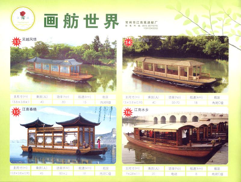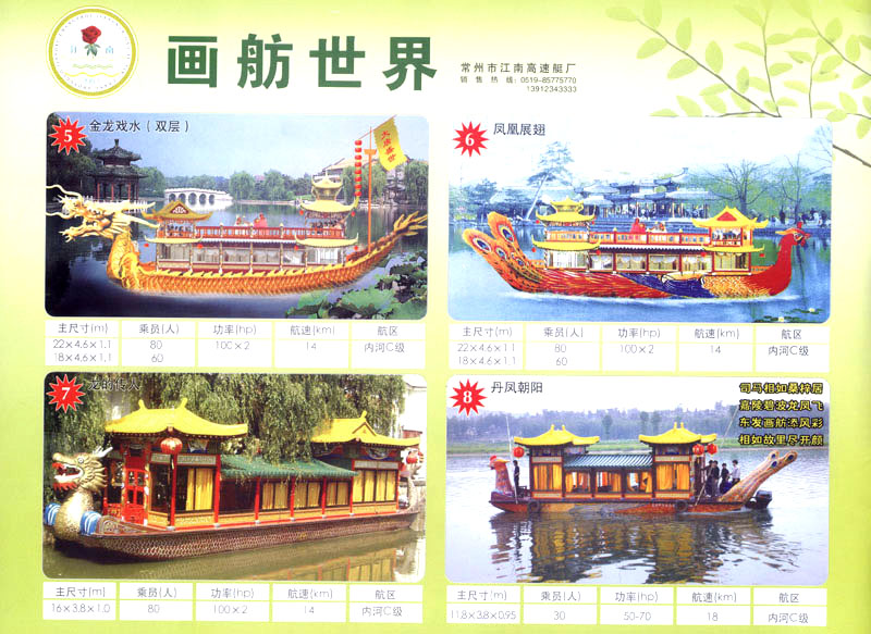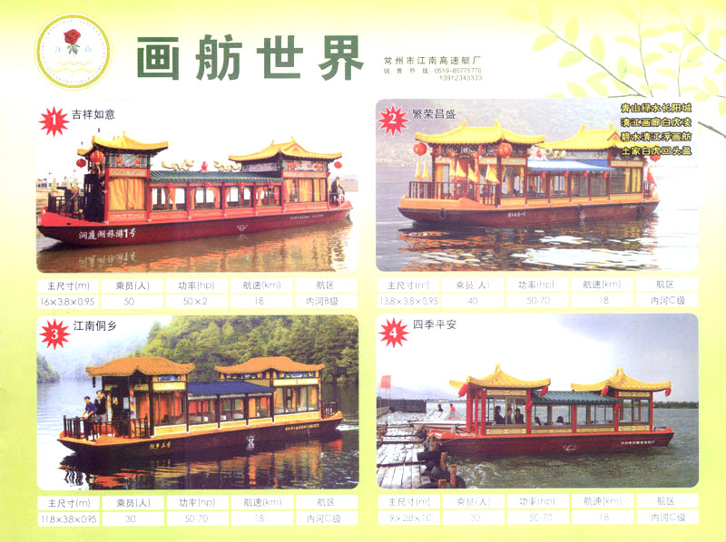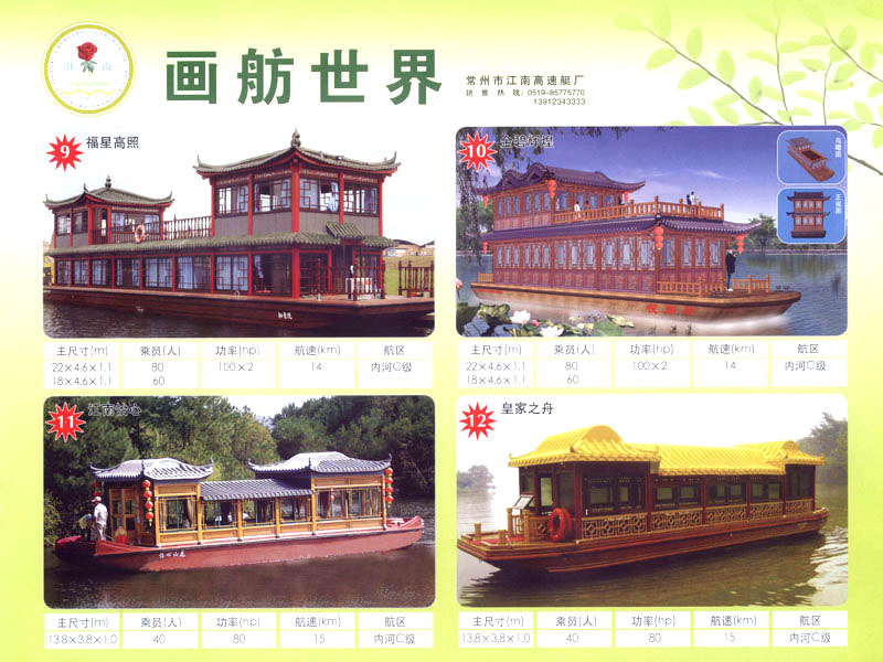 隨著人民生活的提高和水上旅游業(yè)的不斷發(fā)展,原有的游艇已遠(yuǎn)不能滿足人民群眾不斷提高的需求。為適應(yīng)水上旅游業(yè)市場的變 化,我廠開發(fā)研制了符合中國國情、具有民族特色的仿古畫舫游艇及國際最新流行款式一城市旅游休閑觀光艇。特別近兩年又開發(fā)了一批精品畫舫船投放市場之后深受景區(qū)的歡迎。今年我廠又開發(fā)了適用少數(shù)民族的“風(fēng)雨橋”、“寨門”畫舫艇。在湖南、廣西、云南、貴州深受愛戴。此艇別具風(fēng)格,民族風(fēng)情特別濃厚。侗鄉(xiāng)一號計劃在2006年5月1日投放在貴州黎平侗鄉(xiāng)風(fēng)景區(qū)八舟河景區(qū)使有(風(fēng)序號)。我廠歡迎用戶來圖加工,來廠考察訂貨,畫舫艇款式多多,終有一款適合你。歡迎來電來函垂詢。索樣即寄。誠心銷售、人情化服務(wù)、企業(yè)文化、精品畫舫。