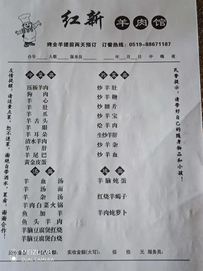 武進(jìn)區(qū)鄭陸寧河全羊館從事羊肉經(jīng)營四十年,羊館經(jīng)營面積300平方米,從羊頭到羊蹄都能做菜:羊頭、羊排、羊拐、羊蹄、羊耳,其他還有羊羔,烤羊,羊湯面,清水羊肉,全羊宴。羊肉湯只是白煮,湯白而濃稠,肉爛味鮮,還不腥不油不膩。你若細(xì)看菜單就能發(fā)現(xiàn),全羊席幾乎都是拿燉湯帶出來的,這更加顯示出羊肉湯的魅力。