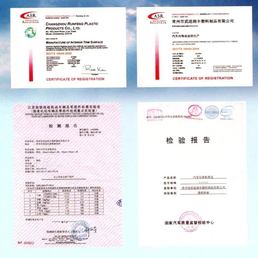 常州市武進(jìn)潤(rùn)豐塑料制品有限公司地處風(fēng)景美麗經(jīng)濟(jì)發(fā)達(dá)的長(zhǎng)江三角洲常州市東郊禮嘉鎮(zhèn),公司占地面積約8000平方米,且地理位置優(yōu)越,是中外客商常涉之地。 本公司專業(yè)生產(chǎn)汽車儀板軟化表皮、PVC門(mén)護(hù)板表皮、PVC復(fù)合制品、壓延薄膜制品,(塑料制品除醫(yī)用塑料制品),車輛零部件,機(jī)械電器零部件,電子元件,沖壓件制造,加工無(wú)妨制品,玻纖氈(GFP板),麻氈板等。本公司的產(chǎn)品在國(guó)內(nèi)一線乘用車上廣泛使用。產(chǎn)品通過(guò)國(guó)家汽車質(zhì)量監(jiān)督檢驗(yàn)中心檢測(cè),并取得了各種證書(shū),如亞瑟國(guó)際認(rèn)證;ISO/TS1694:2009等。 本公司技術(shù)力量雄厚,生產(chǎn)設(shè)備先進(jìn)。多年來(lái),建立了較完善的質(zhì)量管理體系,以先進(jìn)的檢測(cè)技術(shù),優(yōu)質(zhì)的服務(wù)態(tài)度,向客戶提供最優(yōu)秀的產(chǎn)品,在同行中享有良好的聲譽(yù)。 歡迎新老客戶來(lái)公司指導(dǎo),洽談,合作。