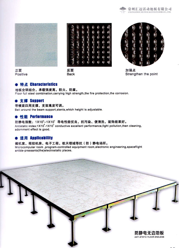 常州匯邁活動地板有限公司地處鄉(xiāng)鎮(zhèn)工業(yè)發(fā)達的江蘇省常州市。北靠滬寧高速公路、東臨上海、交通便利。多年來,公司以其硬朗的產(chǎn)品質量.良好的商業(yè)信譽,嚴格的企業(yè)管理,迅速發(fā)展成為國內生產(chǎn)全鋼活動地板的知名企業(yè)。 本公司致力于高新技術產(chǎn)品開發(fā)、生產(chǎn)、研究的綜合性企業(yè):主要生產(chǎn)和經(jīng)營防靜電網(wǎng)絡地板系列.主要包括:陶瓷防靜電活動地板、無邊地板、硫酸鈣防靜電地板、OA網(wǎng)絡活動地板等。公司按照GB6650—86與IS09001 :2000系列質量標準化管理和標準化生產(chǎn),以市場為導向.不斷對現(xiàn)有產(chǎn)品進行優(yōu)化、更新,對生產(chǎn)線進行技術改造,力求減低成本,提高效辜。努力在市場競爭中占據(jù)優(yōu)勢。本公司為中國信息產(chǎn)業(yè)部認證企業(yè).質量由國家信息產(chǎn)業(yè)部防靜電產(chǎn)品質量監(jiān)督檢測中心認可。 公司大力發(fā)展國內殛海外銷售業(yè)務,公司采用各種有效的營銷手段,向客戶展示了公司及產(chǎn)品的良好形象,多次中標國內重點裝飾工程 同時。公司積極融入全球經(jīng)濟發(fā)展,積極拓展海外業(yè)務。 匯邁地板將一如既往,開發(fā)和制造一流的產(chǎn)品,吸引和培養(yǎng)一流的人才,擁有和完善一流的服務,建立和發(fā)展一流的形象,迎接新時代!