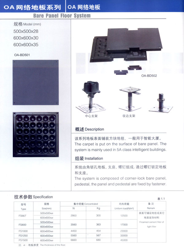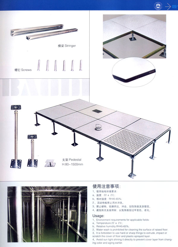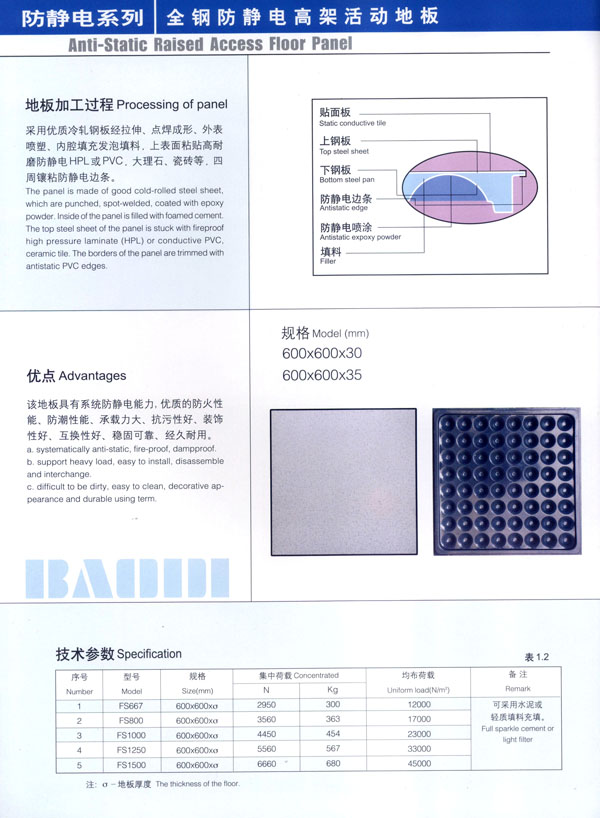 公司主要產(chǎn)品“寶迪”牌 防靜電高架地板及板材、OA網(wǎng)絡(luò)地板。產(chǎn)品廣泛用于電子廠房、金融系統(tǒng)、電力、廣電、軍隊(duì)及智能化樓宇。并向多個(gè)國(guó)家出口。