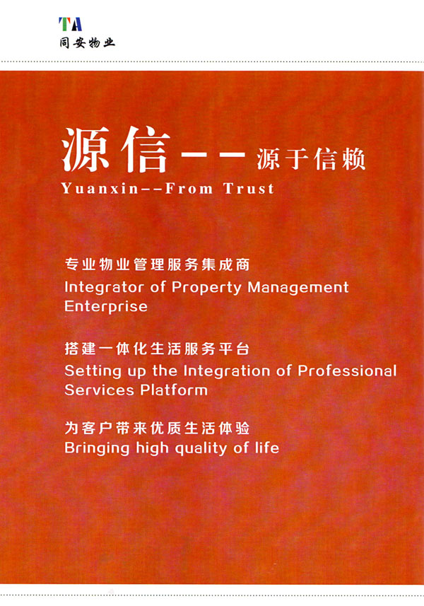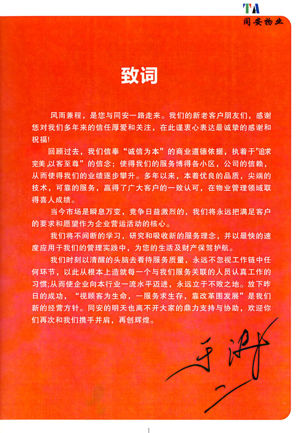 常州市同安物業(yè)管理有限公司注冊(cè)1999年,發(fā)展至今已有多年歷史,本公司坐落于美麗的龍城常州,秉承“融聚無限未來”的核心理念,融專業(yè)認(rèn)才,匯優(yōu)質(zhì)資源以”專心,細(xì)心,耐心”的服務(wù)態(tài)度,為客戶打造“安心,順心,稱心”的服務(wù)感受。 公司始終以“打造中國最值得信賴和最值得尊重的物業(yè)管理服務(wù)集成商”為愿景自我鞭策,不斷前行。同安物業(yè)以客戶滿意為終極目標(biāo),不斷加強(qiáng)”崗位資格認(rèn)證能力,人才招聘與職業(yè)化培訓(xùn)能力,產(chǎn)品策劃與管理設(shè)計(jì)能力,品質(zhì)監(jiān)督與管控能力,技術(shù)更新與運(yùn)營優(yōu)化力“五大專業(yè)能力的培養(yǎng)和提升,實(shí)現(xiàn)“精品化管理,專業(yè)化服務(wù)”。 公司發(fā)展至今,員工總數(shù)近千余人,大專以上學(xué)歷200多人,中高級(jí)技術(shù)人員160人,維修人員140人,物業(yè)管理師80名,公司接管面積達(dá)3100000多平方米,設(shè)涉及住宅小區(qū),別墅,大型游樂場,公園,醫(yī)院,廠區(qū),商業(yè)等。公司的工作管理逐步導(dǎo)入ISO9001質(zhì)量體系和ISO4001環(huán)境管理體系和GB/T28001職業(yè)健康安全管理體系,嚴(yán)格按照質(zhì)量體系的標(biāo)準(zhǔn)執(zhí)行。