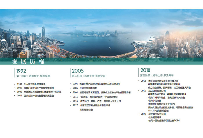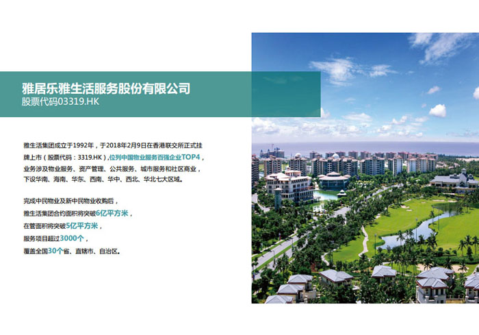 一、立足北上廣,面向全中國,走向全世界 1992年,雅居樂物業(yè)開篇中山,率先引入港式物業(yè)管理模式。1997年,依托雅居樂地產(chǎn)的崛起,連續(xù)接管中山多個項(xiàng)目,成為高端大盤物業(yè)管理的領(lǐng)跑者。1999年,雅居樂物業(yè)開啟專業(yè)化發(fā)展模式,全面通過英國皇家BSI的ISO9000質(zhì)量管理體系認(rèn)證,2001年成為國家首批一級物業(yè)管理資質(zhì)企業(yè)。 2002年,隨著廣州雅居樂花園的盛大啟幕,雅居樂物業(yè)邁開向廣州進(jìn)軍的步伐。為尋求更長遠(yuǎn)的發(fā)展,雅居樂積極構(gòu)思上市藍(lán)圖,2005年在香港成功上市。在深耕珠三角城市群的同時,2006年雅居樂物業(yè)揮師北上,正式開啟全國部署戰(zhàn)略。2008年,接管海南清水灣項(xiàng)目,揭開旅游地產(chǎn)物業(yè)管理的新篇章。 接下來近十年里,雅居樂物業(yè)始終保持著最年輕的成長姿態(tài),依托“管理數(shù)字化、服務(wù)專業(yè)化、流程標(biāo)準(zhǔn)化和操作機(jī)械化”的發(fā)展戰(zhàn)略,雅居樂物業(yè)榮膺2018中國物業(yè)服務(wù)百強(qiáng)企業(yè)第11名,2018年中國物業(yè)服務(wù)百強(qiáng)企業(yè)成長性第二名、2018年中國物業(yè)服務(wù)百強(qiáng)服務(wù)質(zhì)量領(lǐng)先企業(yè)、2018年中國物業(yè)服務(wù)百強(qiáng)滿意度領(lǐng)先企業(yè)、2018中國物業(yè)服務(wù)百強(qiáng)經(jīng)營績效領(lǐng)先企業(yè)、旅游地產(chǎn)物業(yè)管理領(lǐng)先品牌、2018年中國辦公物業(yè)管理優(yōu)秀企業(yè)(綠地物業(yè))、2017中國物業(yè)管理企業(yè)品牌價值第12名、2017中國物業(yè)管理企業(yè)綜合實(shí)力第12名、中國藍(lán)籌物業(yè)企業(yè)、《旅游地產(chǎn)物業(yè)管理服務(wù)標(biāo)準(zhǔn)》(團(tuán)體標(biāo)準(zhǔn))起草工作等多項(xiàng)殊榮。 目前,雅生活集團(tuán)已形成廣州、中山、深圳、南京、上海、西安、成都、海南、云南、北京、鄭州、南寧、沈陽、武漢、馬來西亞十五大城市公司全面發(fā)展的蓬勃態(tài)勢。截止2017年12月31日,雅生活集團(tuán)管理范圍覆蓋全國逾69座城市與地區(qū),服務(wù)類型涵蓋主流住宅、高端豪宅、旅游地產(chǎn)、商業(yè)、寫字樓等多種業(yè)態(tài),合約總建筑面積為12610萬平方米,擁有200多個項(xiàng)目,服務(wù)業(yè)主逾100萬人。 2017年6月,雅生活集團(tuán)收購綠地物業(yè)100%股權(quán),并與綠地集團(tuán)簽署戰(zhàn)略合作協(xié)議,8月,綠地集團(tuán)投資10億元獲得雅生活集團(tuán)20%股權(quán)。未來,雅生活集團(tuán)將實(shí)施“雅居樂物業(yè)”與“綠地物業(yè)”雙品牌驅(qū)動戰(zhàn)略,還將尋求在A股上市,力爭打造中國物業(yè)“A+H”第一股。
