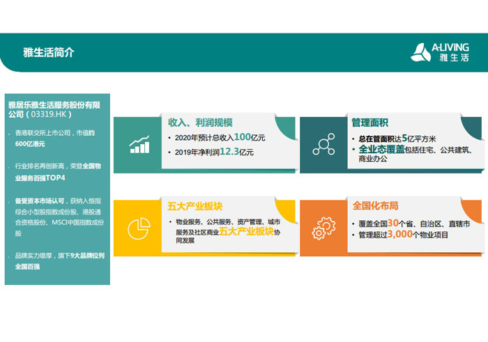 “人是雅居樂關(guān)注的核心,雅居樂不僅要蓋好房子,更希望全方位呵護(hù)業(yè)主的一生! 2015年,雅居樂集團(tuán)重新定義社區(qū)服務(wù)理念,以聯(lián)動發(fā)展模式,整合最優(yōu)質(zhì)的社區(qū)資源,為業(yè)主提供全面的居家生活解決方案。因此,雅居樂集團(tuán)“1+N”多元發(fā)展戰(zhàn)略規(guī)劃下的首個產(chǎn)業(yè)集團(tuán)——雅生活集團(tuán)應(yīng)運(yùn)而生。目前雅生活集團(tuán)已集結(jié)物業(yè)、科技、旅游、廣告、營銷、驗(yàn)房六大業(yè)務(wù)艦隊(duì)。2018年2月9日,雅生活集團(tuán)正式在香港聯(lián)合交易所主板掛牌上市(股票代碼03319.HK),成為中國首家紅籌分拆H股的物業(yè)服務(wù)企業(yè)。