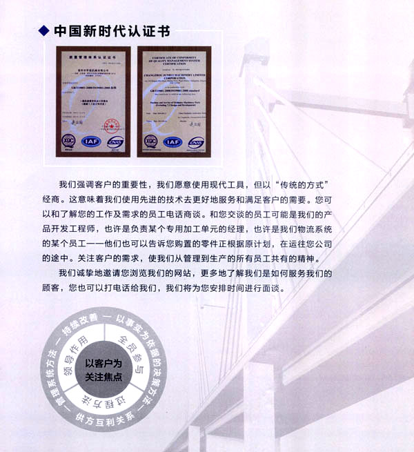 公司于2007年6月通過IS09001質(zhì)量體系認(rèn)證。本著信譽第一,誠實合作,嚴(yán)格管理為服務(wù)宗旨,全員參與、持續(xù)改善。提升品質(zhì)、準(zhǔn)時交貨、客戶滿意的質(zhì)量方針。為客戶提供優(yōu)質(zhì)的產(chǎn)品,周到的服務(wù)。嚴(yán)格的品質(zhì),快捷的送貨,完善的生產(chǎn)設(shè)備,一流的技術(shù),使公司在同行業(yè)中占有一席之地。