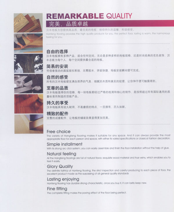 常州漢豐裝飾材料有限公司是一家涉及強化地板制造、屏風(fēng)鋁材生產(chǎn)、進出口貿(mào)易的大型公司。2001年公司投入重資.全面引進世界頂級一體化自動流水生產(chǎn)線和具有國際先進水準的德國權(quán)威木地板生產(chǎn)技術(shù),興建強化地板生產(chǎn)基地。多年以來.一直不斷加強生產(chǎn)設(shè)備、廠房基礎(chǔ)投入,目前公司年生產(chǎn)強化地板能力已經(jīng)達到了500萬平方米,步入國內(nèi)一流行列,具備了雄厚的國際競爭力。 漢豐地板以奉獻生活中最完美的地板為發(fā)展目標,時尚流行的設(shè)計風(fēng)格和多樣化的產(chǎn)品類型,贏得了市場的廣泛贊譽和肯定。產(chǎn)品嚴格按照歐洲標準檢測強化木地板的各項性能指標.達到百分百的國際技術(shù)標準,確保了每一塊地板都有著上乘品質(zhì),是綠色環(huán)保的好地板。并先后通過了Isc)9001國際質(zhì)量管理體系認證,IS014001國際環(huán)境管理體系認證.中國環(huán)境標志產(chǎn)品認證,深得用戶的一致好評,是寫字樓、商場、大型超市、學(xué)校、建筑樓宇、娛樂場所、家用私宅等鋪裝的首選地板。