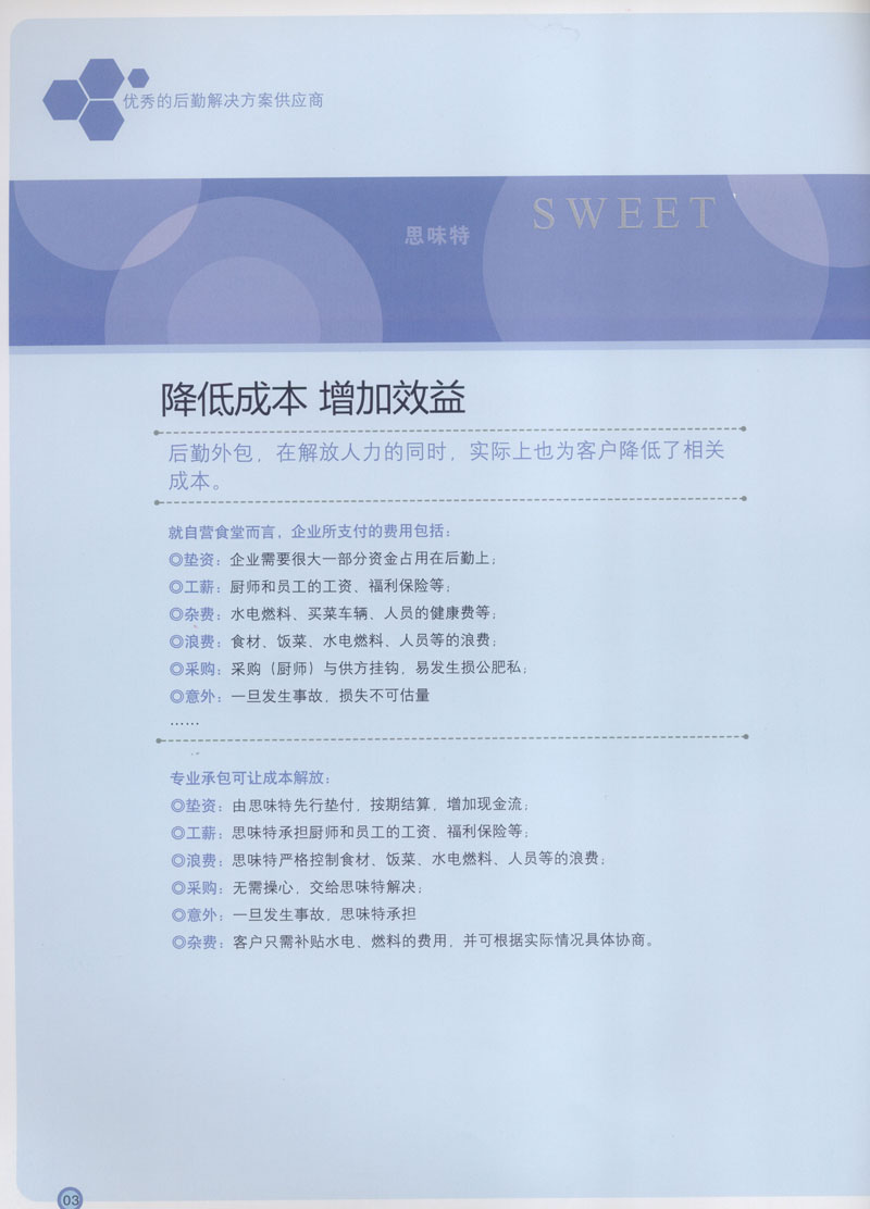 常州市思味特餐飲有限公司是一家專業(yè)從事企事業(yè)后勤服務(wù)的有限責(zé)任公司,公司從承包食堂起步,逐漸發(fā)展為經(jīng)營團(tuán)膳承包、營養(yǎng)送餐、生活區(qū)管理、連鎖餐廳的綜合型企業(yè)。2008年公司斥資100萬元,在常州興建了可以同時提供3000餐膳食的中央廚房,重點(diǎn)打造“和美客”后勤服務(wù)品牌,全力為企事業(yè)單位解決后勤后顧之憂。