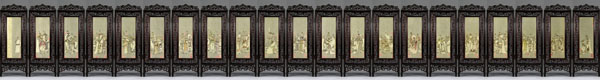 4 牙刻《三國演義圖》,作者懷著對(duì)牙刻藝術(shù)的鐘愛,對(duì)中華古老文化之敬仰,肩負(fù)時(shí)代之重托,賦予作者堅(jiān)韌不撥的決心和毅力。牙刻《三國演義》創(chuàng)作靈感被點(diǎn)燃,博大、深遂、精致而具有鮮明文化特質(zhì)的牙刻作品自然天成,得以成就夢(mèng)寐以求的作品。由微雕63萬余漢字《三國演義》全文作為灰色背景,105枚金石名章烘托出《三國演義》名著中各領(lǐng)風(fēng)騷、形象鮮明的126個(gè)主要人物。由21扇牙刻紫檀組合成3.28米長的巨型屏風(fēng),寓意著對(duì)美好21世紀(jì)的憧憬。小牙刻大題材、大系列、大氣魄、大氣象,最終產(chǎn)生巨大的震撼力。牙刻《三國演義》如此恢弘絕無僅有、前無古人。從表象看牙刻與微雕的融合、書法金石與人物的呼應(yīng)、灰色背景與墨彩的烘托,精雕紫檀與微雕牙刻的對(duì)照,而深層次看這些都是繪畫語言在牙刻藝術(shù)中的完美體現(xiàn),也突破了千余年來固守線刻傳統(tǒng)的窠臼,提升了當(dāng)今牙刻藝術(shù)的品位并注入新的活力,將牙刻從藝人勞動(dòng)升華為藝術(shù)家從事的創(chuàng)作。這件作品是我歷時(shí)五年于2001年10月雕刻而成,一經(jīng)展出引起了工藝美術(shù)界高度關(guān)注,獲得了首屆中國華東工藝美術(shù)精品展金獎(jiǎng)、第三屆國家級(jí)工藝美術(shù)大師精品展金獎(jiǎng)、首屆中國工藝美術(shù)學(xué)會(huì)最高學(xué)術(shù)獎(jiǎng)“華藝杯”金獎(jiǎng)。