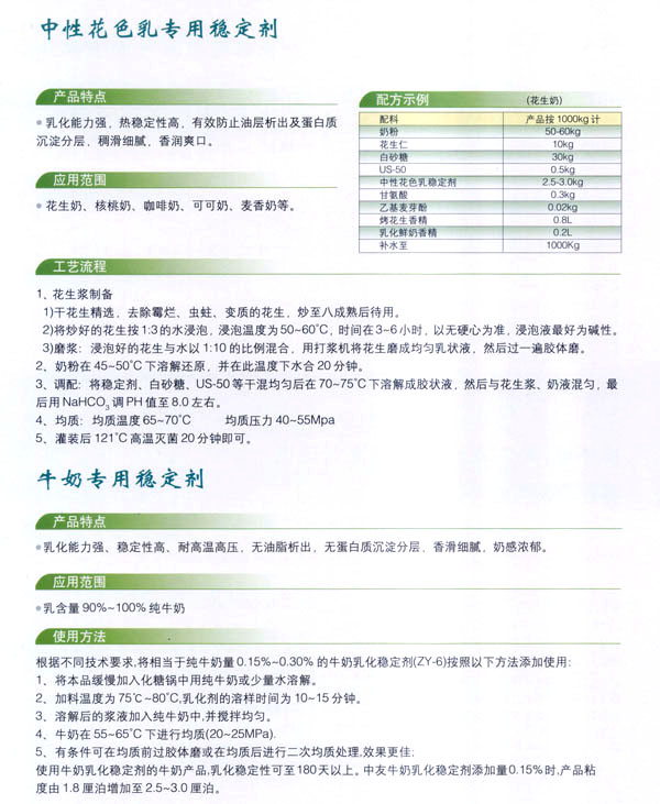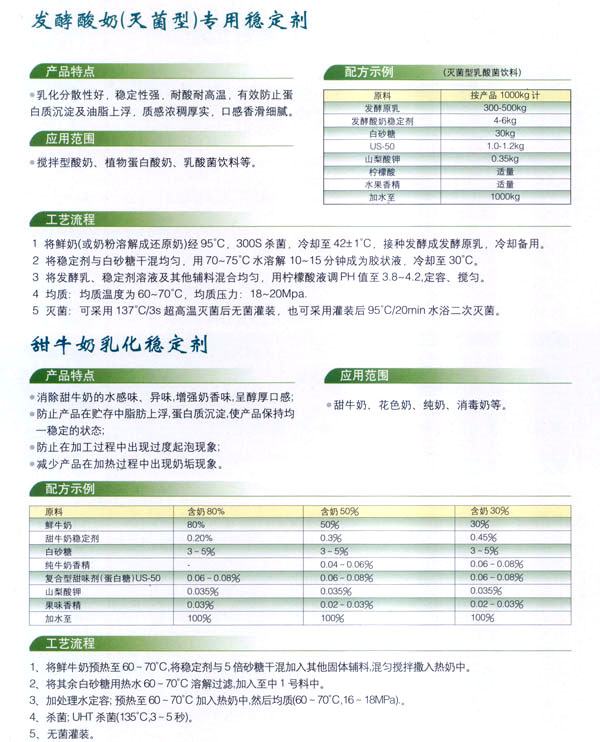 常州市中友食品有限公司;匚挥诔V菔袞|郊開發(fā)區(qū),廠房占地面積6000平方米,擁有全新的生產(chǎn)線,先進(jìn)的生產(chǎn)流程和嚴(yán)格的質(zhì)量管理體系(工廠已通過IS09001:2000質(zhì)量管理體系的認(rèn)證)。并有專業(yè)的技術(shù)開發(fā)和理化檢驗(yàn)的設(shè)施、經(jīng)驗(yàn)豐富的技術(shù)人員。公司以科技為依托,常年與高等院校合作,不斷地開發(fā)和研制適合市場需求的食品添加劑系列產(chǎn)品。公司每年面向全國招收優(yōu)秀的博士、碩士及優(yōu)秀的大學(xué)生。公司現(xiàn)有員工1 00多人,管理人員2 0名、高工5名、產(chǎn)品專業(yè)技術(shù)開發(fā)人員12名,還有選擇地引進(jìn)和代理國內(nèi)外各種適用的食品添加劑。 依靠本公司雄厚的科技力量和先進(jìn)的科技設(shè)備,生產(chǎn)基地已經(jīng)具備了與客戶共同開發(fā)國內(nèi)外先進(jìn)食品添加劑的應(yīng)用技術(shù)。博適中友公司多年來致力于食品添加劑的研究和開發(fā),突破常規(guī)理念,以市場、用戶為中心,研究開發(fā)各個品種、各個檔次的食品添加劑,品種齊全又多樣,既有出口型又有內(nèi)銷型。公司主要穩(wěn)定劑產(chǎn)品有:乳飲料乳化穩(wěn)定劑、乳酸飲料乳化穩(wěn)定劑、冰淇淋(雪糕)復(fù)合乳化穩(wěn)定劑、果汁飲料乳化穩(wěn)定劑等,產(chǎn)品暢銷國內(nèi)外,覆蓋了全國二十多個省市,并建立了穩(wěn)定的銷售網(wǎng)絡(luò)。 本公司對產(chǎn)品指定了嚴(yán)格的質(zhì)量標(biāo)準(zhǔn),并報請常州市技術(shù)檢驗(yàn)監(jiān)督局審核批準(zhǔn),其技術(shù)要求完全符合GB一2760(食品添加劑使用衛(wèi)生標(biāo)準(zhǔn))和符合聯(lián)合國直接衛(wèi)生組織(WHO)、聯(lián)合國食品與農(nóng)業(yè)組織(FAO)以及美國食品和藥物管理局的有關(guān)規(guī)定。 長期以來,博適中友公司以市場定位為基本依據(jù),堅持發(fā)展并開辟多元化的國內(nèi)外市場:以專業(yè)化、長遠(yuǎn)化、規(guī);癁榻(jīng)營思路:以開拓創(chuàng)新,務(wù)實(shí)誠信為經(jīng)營理念,不斷促進(jìn)企業(yè)發(fā)展壯大。 公司自創(chuàng)建以來,始終不渝地堅持質(zhì)量第一、信譽(yù)至上,以精湛的工藝加工產(chǎn)品,不管是標(biāo)準(zhǔn)的或特制的都可享有本公司優(yōu)良的技術(shù)服務(wù)。無論您需要何種功能性添加劑,博適中友食品添加劑公司均能滿足您的要求。博適中友公司以價格合理、服務(wù)周到為經(jīng)營宗旨,努力引導(dǎo)食品添加劑應(yīng)用發(fā)展的新潮流、新方向。在才能卓越的領(lǐng)導(dǎo)者的帶領(lǐng)下,全體員工以開拓、創(chuàng)新、求實(shí)、守信為企業(yè)精神,不斷地提高自身的素質(zhì)。 公司的宗旨是“開拓創(chuàng)新發(fā)展、精誠服務(wù)和諧”為目標(biāo),熱忱與各界有識之士攜手共進(jìn),共創(chuàng)輝煌!如今公司業(yè)務(wù)蒸蒸日上,專業(yè)技術(shù)研究越走越精,這都與廣大客戶大力支持分不開。在新世紀(jì)來臨之際,上海博適中友公司愿與您真誠合作,攜手并進(jìn),共鑄新的輝煌!