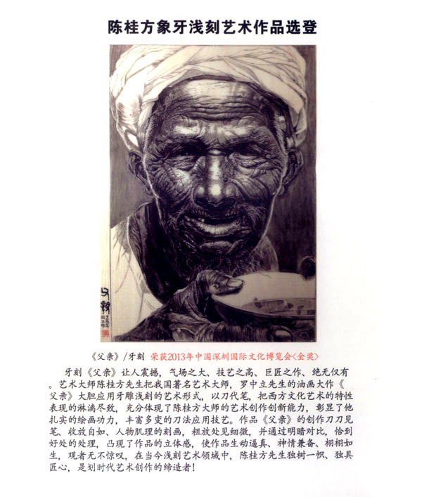 陳桂方,江蘇常州武進人,中國著名雕刻藝術(shù)家,江蘇省工藝美術(shù)大師、研究員級、高級工藝美術(shù)師,江蘇省非物質(zhì)文化遺產(chǎn)《象牙淺刻》代表性傳承人。畢業(yè)于中國書畫函授大學(xué),深造于清華大學(xué)、南大美術(shù)系,現(xiàn)任中國工藝美術(shù)協(xié)會會員,江蘇省工藝美術(shù)學(xué)會理事,常州市工藝美術(shù)家協(xié)會副秘書長,常州市工藝美術(shù)行業(yè)協(xié)會常務(wù)理事,武進工藝美術(shù)協(xié)會副主席。陳桂方大師淺刻作品的藝術(shù)特點:山水氣韻生動,氣勢磅礴,場面壯觀,刀法細膩:人物仕女生動可人,栩栩如生,充分表達體現(xiàn)了中國象牙工藝獨具的內(nèi)在文化底蘊和現(xiàn)代社會的審美觀念及獨特的淺刻藝術(shù)表現(xiàn)技藝。對每件藝術(shù)作品創(chuàng)作都精益求精,強調(diào)藝術(shù)創(chuàng)作的思想性、意境及內(nèi)涵。注重章法構(gòu)思,掌握牙刻藝術(shù)的特性表現(xiàn),作品具有鮮明生動的時代氣息,獨具所創(chuàng)工筆與寫意相結(jié)合的牙刻藝術(shù)表現(xiàn)手法和表現(xiàn)形式,出眾、飄逸、多變的刀法技藝,粗獷處見細微、方寸間見大觀的創(chuàng)作理念深受專家權(quán)威的肯定和業(yè)內(nèi)人士的一致好評。陳桂方大師至企頑事象牙淺刻藝術(shù)創(chuàng)作近四十余載,完善了自己的創(chuàng)作體系,成就了自己獨特的藝術(shù)風(fēng)格。作品數(shù)年來連續(xù)二十多次榮獲國家最高藝術(shù)精品大獎《金獎》,象牙淺刻作品《李逵探母》已被國家工藝美術(shù)館收藏,并頒發(fā)了國家收藏證書,在全國數(shù)十年間尚屬首次。當(dāng)前,陳桂方牙刻藝術(shù)作品已深受廣大海內(nèi)外業(yè)內(nèi)人士、收藏家們的鐘愛、青睞、熱藏,并被譽為當(dāng)代最杰出最具潛質(zhì)的實力派藝術(shù)大師。