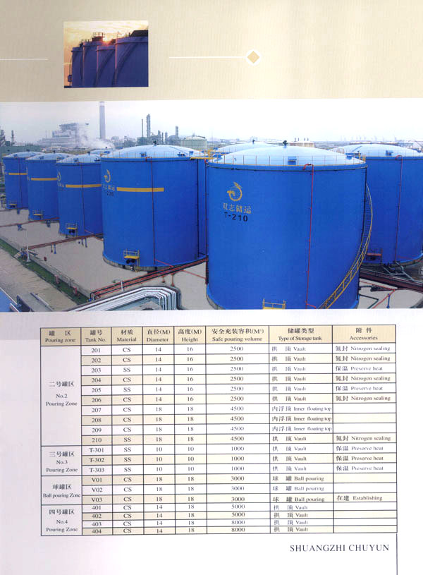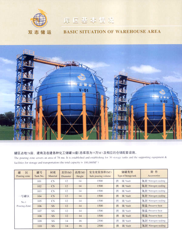 常州市雙志石油化工儲運有限公司,位于國家一類對外開放口岸常州石化港區(qū),是一家專業(yè)石油化工產品倉儲公司。罐區(qū)占地78畝,建有各種化工儲罐30座(總庫容為10萬m3)及相應的倉儲配套設施。經海關批準,設有海關保稅庫和海關監(jiān)管庫。公司專業(yè)從事石油化工產品倉儲、中轉、分撥、灌裝業(yè)務,以及進出口貨物的代理報關、接受金融機構委托提供動產質押監(jiān)管服務。