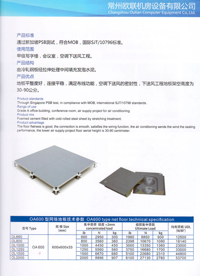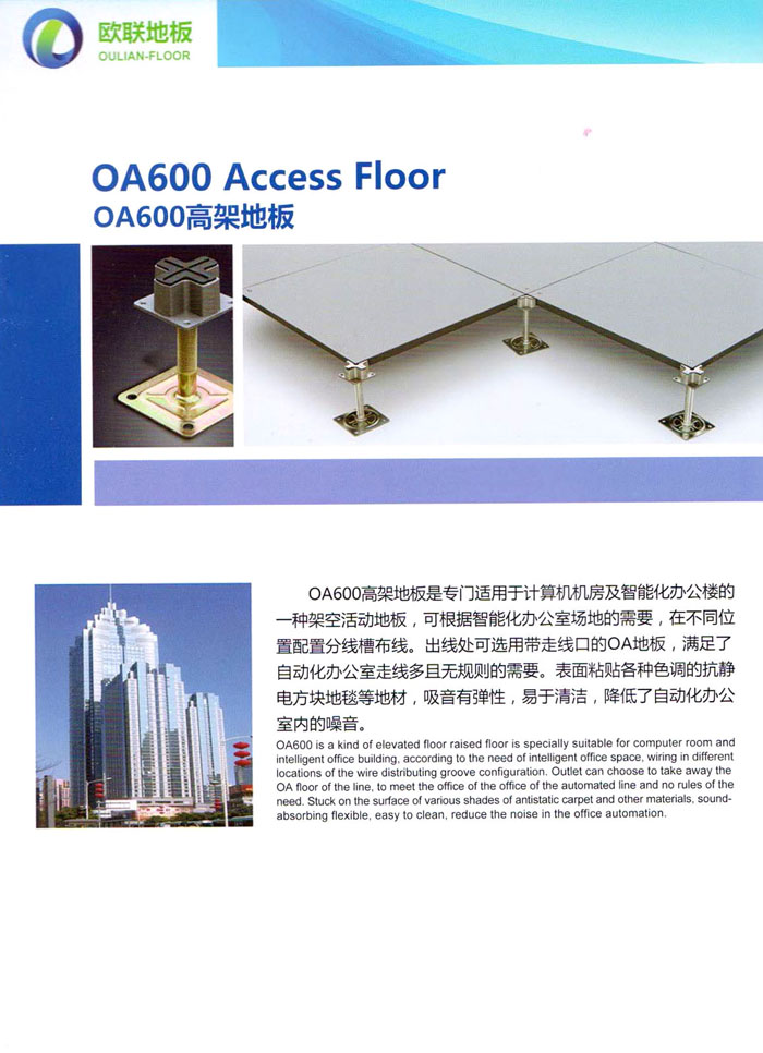 防靜電高架活動(dòng)地板、全鋼地板、陶瓷地板是計(jì)算機(jī)行業(yè)發(fā)展起來的新型鋪地材料,隔離了潮氣、靜電灰塵,最重要的是解決了綜合布線問題,無需預(yù)埋管線,可隨時(shí)拆卸、搬移,保證了資訊設(shè)備完整的優(yōu)點(diǎn),適應(yīng)了智能化樓宇中信息自動(dòng)化技術(shù)對(duì)所處環(huán)境的特定要求,避免了廣大客戶的雙重投資,使現(xiàn)代化辦公程度更加高效,辦公場(chǎng)所更加舒適。 “歐聯(lián)”系列全鋼地板,符合國(guó)家安全要求,種類完備多樣,其中防靜電陶瓷地板、硫酸鈣地板等除具有普通瓷質(zhì)的裝飾和實(shí)用性外,其耐磨、防水、防火功能優(yōu)于其它同類產(chǎn)品,防靜電系列地板,能切合不同客戶的要求,其靈活的配置,深受客戶歡迎,不同材質(zhì)的地板結(jié)構(gòu)使設(shè)計(jì)師的設(shè)計(jì)空間比傳統(tǒng)的更加廣闊自由和善變。 公司大力發(fā)展國(guó)內(nèi)外銷售業(yè)務(wù),多次中標(biāo)國(guó)內(nèi)重點(diǎn)工程 ,例:哈爾濱醫(yī)科大學(xué)、山東大學(xué)、上海普通機(jī)場(chǎng)等。 公司將一如既往開發(fā)和制造一流的產(chǎn)品,愿與廣大有識(shí)之士合作發(fā)展,共創(chuàng)美好未來。