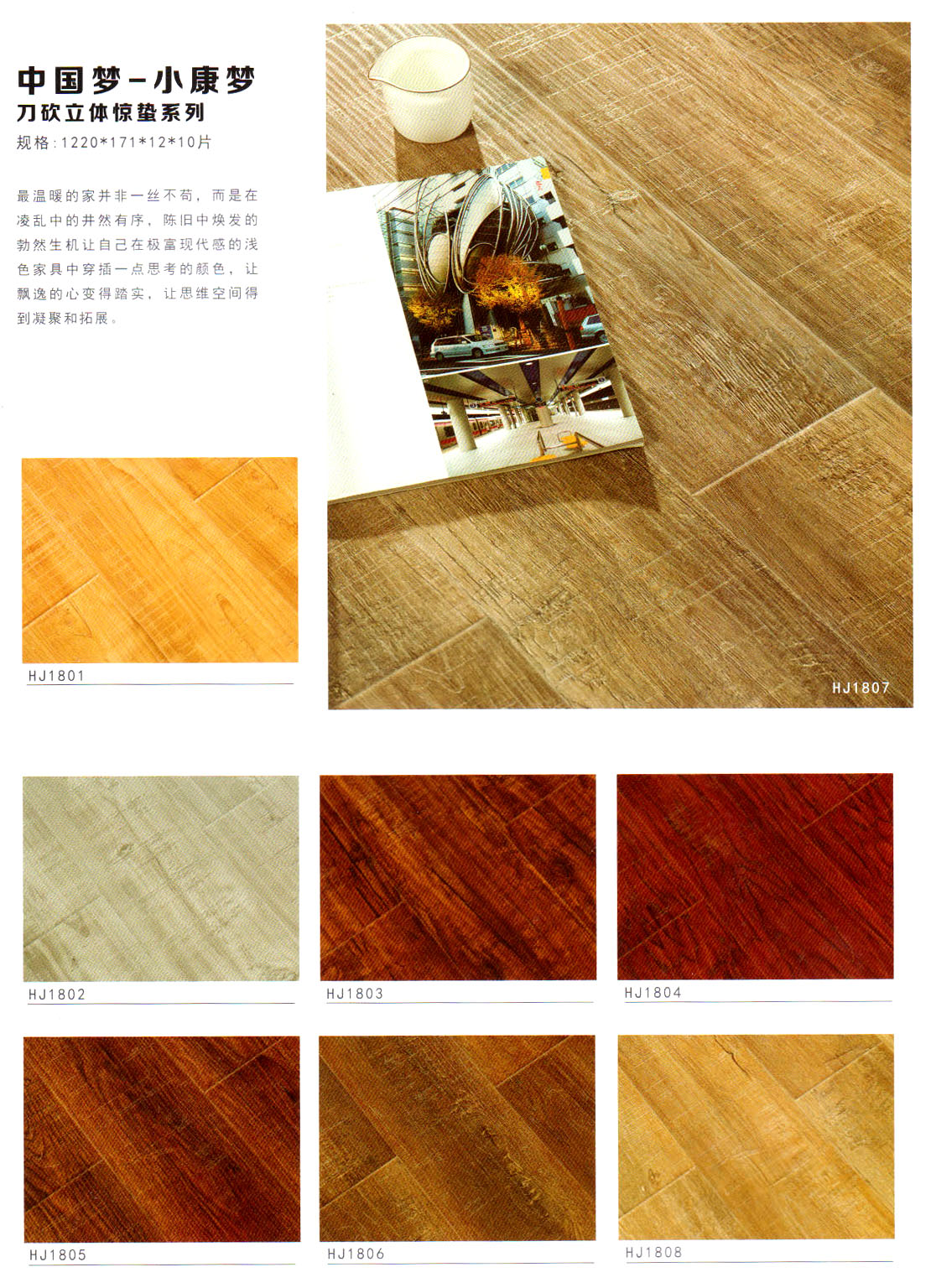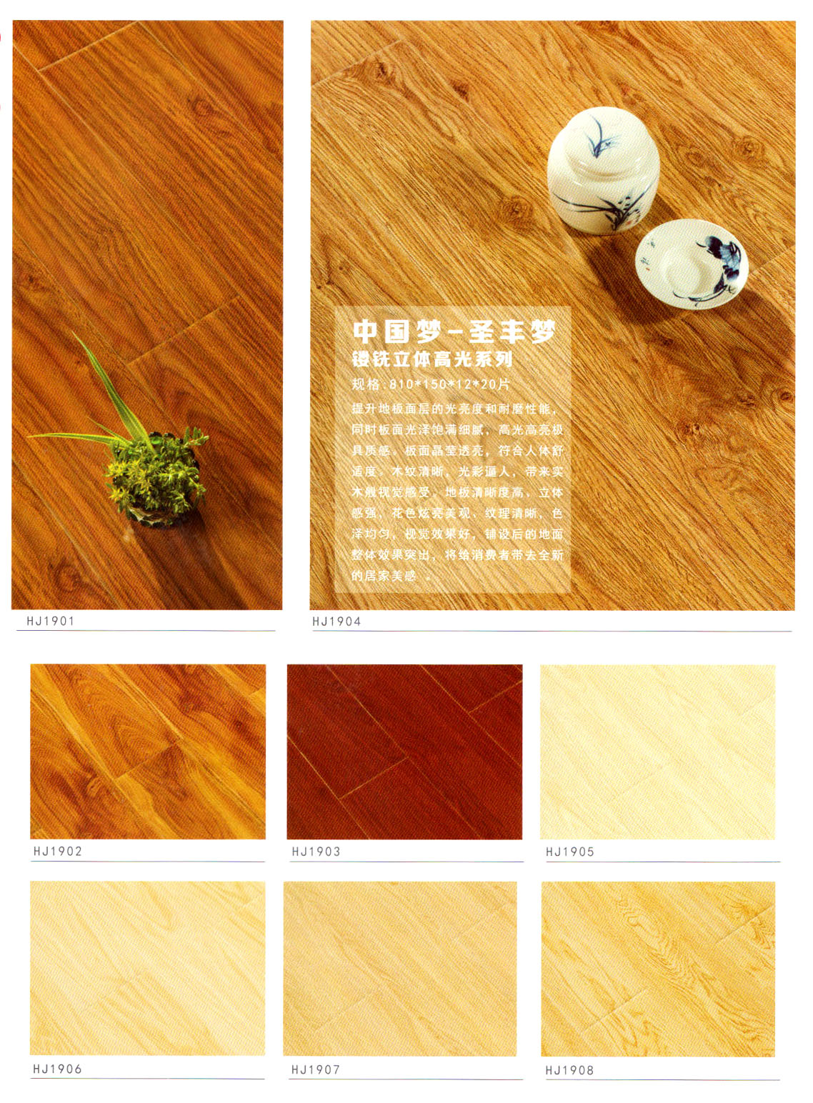 目前我們主要經(jīng)營“惠居”、  “靈盛”牌木質(zhì)強化地板,現(xiàn)在已經(jīng)開發(fā)出水晶面、羽絲面、浮雕面、立體刀砍紋、手抓紋、4v仿實木、金剛淋漆面、模壓面、橡木真木紋、防水系列等多個系列產(chǎn)品,涵蓋了市場上所出現(xiàn)的所有產(chǎn)品系列!