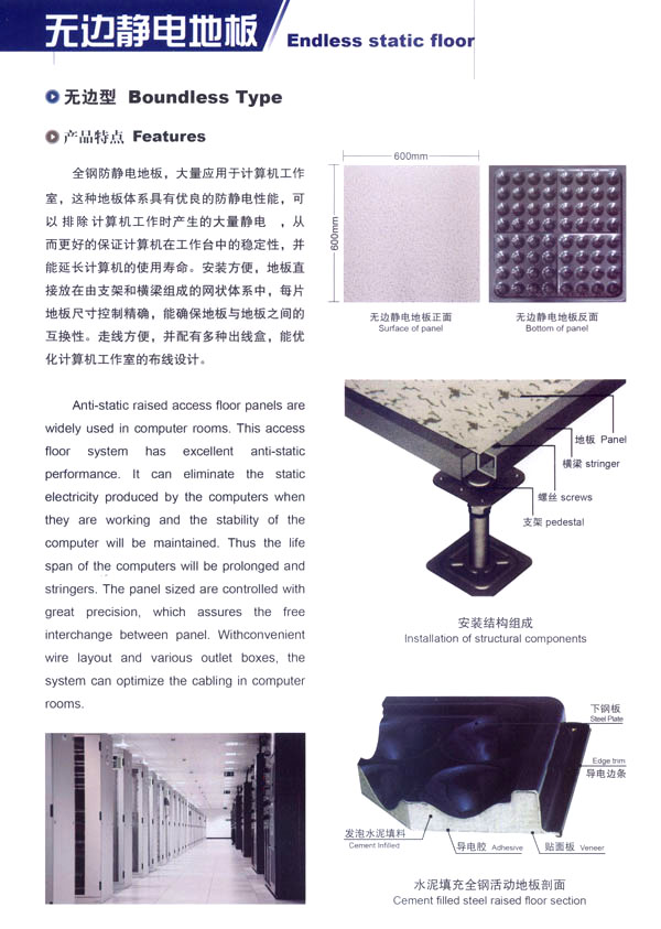 常州星峰活動地板有限公司地處常州市橫林鎮(zhèn)前豐工業(yè)園區(qū),東鄰無錫。南有312國道。京杭大運河、北臨滬寧高速公路,交通便捷。本公司資質(zhì)較深,是生產(chǎn)鋼質(zhì)抗靜電地板的專業(yè)廠家。十多年來積累了豐富的經(jīng)驗及雄厚的經(jīng)濟(jì)實力。并以優(yōu)質(zhì)的產(chǎn)品、優(yōu)良的售后服務(wù)贏得了用戶的一致好評。 本公司生產(chǎn)產(chǎn)品廣泛應(yīng)用于電子計算機(jī)房、通訊機(jī)房、電視發(fā)射臺、軍事指揮站、各類實驗室、辦公室及一些管線鋪設(shè)比較集中與要求防靜電場所,市場網(wǎng)絡(luò)縱橫江蘇、山東、福建、甘肅、上海、北京、安徽、浙江、河南等地。