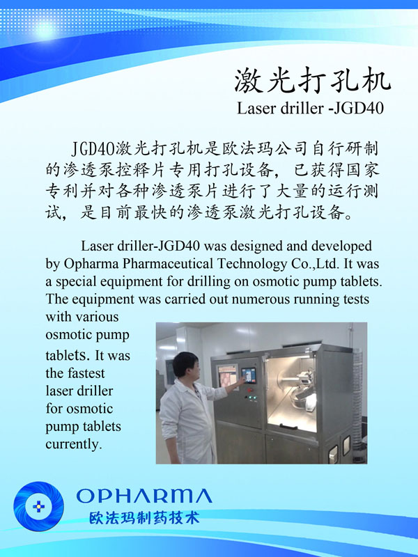 公司始建以來,以前瞻的科學(xué)規(guī)劃,通過自主研發(fā),解決了高速激光打孔機(jī)諸多的世界難題,使之達(dá)到40片/秒以上且精確打孔的國(guó)際領(lǐng)先水平;同時(shí)開發(fā)廢片自動(dòng)識(shí)別、剔除功能,以滿足客戶的實(shí)際所需。公司與瑞士等國(guó)家研究機(jī)構(gòu)的科技合作,以高速激光打孔機(jī)為基礎(chǔ),建設(shè)了滲透泵制劑研發(fā)和中試生產(chǎn)車間,開發(fā)了多種藥物的滲透泵制劑,形成了從關(guān)鍵設(shè)備研制,新制劑開發(fā)、工藝配套,到批量生產(chǎn)測(cè)試的滲透泵制劑開發(fā)全過程技術(shù)團(tuán)隊(duì)和研究設(shè)施。公司瞄準(zhǔn)現(xiàn)代新型釋藥系統(tǒng),吸收國(guó)內(nèi)外高端人才,努力開拓控緩釋技術(shù)、靶向給藥技術(shù)及智能給藥技術(shù)。