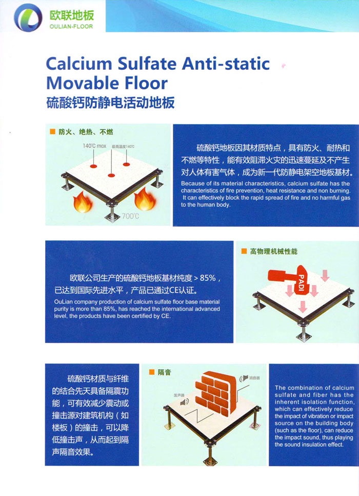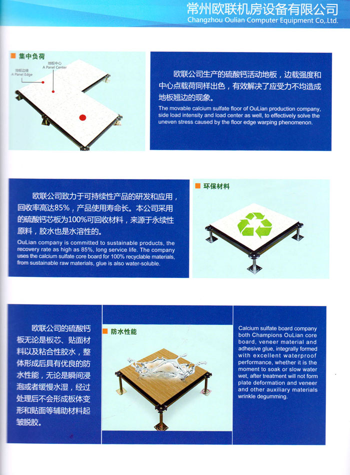 防靜電高架活動(dòng)地板、全鋼地板、陶瓷地板是計(jì)算機(jī)行業(yè)發(fā)展起來(lái)的新型鋪地材料,隔離了潮氣、靜電灰塵,最重要的是解決了綜合布線問(wèn)題,無(wú)需預(yù)埋管線,可隨時(shí)拆卸、搬移,保證了資訊設(shè)備完整的優(yōu)點(diǎn),適應(yīng)了智能化樓宇中信息自動(dòng)化技術(shù)對(duì)所處環(huán)境的特定要求,避免了廣大客戶的雙重投資,使現(xiàn)代化辦公程度更加高效,辦公場(chǎng)所更加舒適。 “歐聯(lián)”系列全鋼地板,符合國(guó)家安全要求,種類完備多樣,其中防靜電陶瓷地板、硫酸鈣地板等除具有普通瓷質(zhì)的裝飾和實(shí)用性外,其耐磨、防水、防火功能優(yōu)于其它同類產(chǎn)品,防靜電系列地板,能切合不同客戶的要求,其靈活的配置,深受客戶歡迎,不同材質(zhì)的地板結(jié)構(gòu)使設(shè)計(jì)師的設(shè)計(jì)空間比傳統(tǒng)的更加廣闊自由和善變。 公司大力發(fā)展國(guó)內(nèi)外銷售業(yè)務(wù),多次中標(biāo)國(guó)內(nèi)重點(diǎn)工程 ,例:哈爾濱醫(yī)科大學(xué)、山東大學(xué)、上海普通機(jī)場(chǎng)等。 公司將一如既往開發(fā)和制造一流的產(chǎn)品,愿與廣大有識(shí)之士合作發(fā)展,共創(chuàng)美好未來(lái)。
