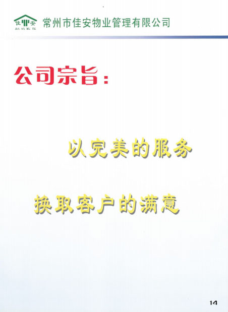 佳安物業(yè)管理有限公司位于常州市新北區(qū)薛家鎮(zhèn),2005年由薛家鎮(zhèn)黨委政府注冊(cè)成立,注冊(cè)資金50萬(wàn)元,屬于三級(jí)資質(zhì)企業(yè)。成立之初,佳安物業(yè)作為政屬事業(yè)單位,主要負(fù)責(zé)管理薛家鎮(zhèn)順園新村安置小區(qū)。隨著薛家鎮(zhèn)經(jīng)濟(jì)和人口的發(fā)展,為主動(dòng)適應(yīng)經(jīng)濟(jì)發(fā)展新常態(tài),全面深化物業(yè)綜合改革,打造具有薛家特色的物業(yè)公司,佳安物業(yè)由政府下屬的事業(yè)單位正式轉(zhuǎn)變?yōu)楠?dú)立運(yùn)營(yíng)的企業(yè),并增資到1000萬(wàn)元。 2017年6月,公司通過(guò)審核被評(píng)為“AAA”級(jí)信用企業(yè),同月,公司實(shí)施ISO9001質(zhì)量管理體系標(biāo)準(zhǔn),并于8月通過(guò)質(zhì)量體系認(rèn)證審核。2018年8月,公司通過(guò)了ISO14001環(huán)境管理體系、ohsas18001職業(yè)健康安全管理體系的認(rèn)證審核。 目前,公司主要承接小區(qū)物業(yè)服務(wù)及廠區(qū)外派保安服務(wù)、保潔服務(wù)等,F(xiàn)公司為薛家鎮(zhèn)順園一村至順園九村安置小區(qū)及奧林匹克花園、怡景名園2處商業(yè)小區(qū)提供物業(yè)服務(wù);為江南農(nóng)村商業(yè)銀行新北區(qū)所有支行、中車鐵馬、投資服務(wù)中心、華夏藝博園、薛家幼兒園、薛家小學(xué)及薛家中學(xué)等單位提供外派保安服務(wù);為薛家鎮(zhèn)中心廣場(chǎng)及松林別墅提供保安服務(wù);為華夏藝博園及投資服務(wù)中心提供保潔服務(wù)等。 在這十余年中,佳安物業(yè)與時(shí)俱進(jìn),銳意進(jìn)取,為地方建設(shè)發(fā)展注入動(dòng)力,為居民和企業(yè)安全保駕護(hù)航,尤其是在實(shí)踐中,我們積極探索,正逐步摸索出一條適合薛家城鄉(xiāng)一體化建設(shè)的社區(qū)物業(yè)管理的新路。希望通過(guò)今天的分享,和大家一起探討我們?cè)凇肮苻k分離”等方面的實(shí)踐經(jīng)驗(yàn),并在此基礎(chǔ)上為薛家的可持續(xù)發(fā)展提供可借鑒、推廣的新型物業(yè)管理之路。