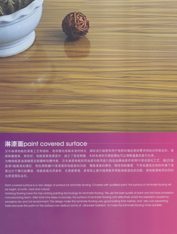 常州漢豐裝飾材料有限公司是一家涉及強化地板制造、屏風鋁材生產(chǎn)、進出口貿易的大型公司。2001年公司投入重資.全面引進世界頂級一體化自動流水生產(chǎn)線和具有國際先進水準的德國權威木地板生產(chǎn)技術,興建強化地板生產(chǎn)基地。多年以來.一直不斷加強生產(chǎn)設備、廠房基礎投入,目前公司年生產(chǎn)強化地板能力已經(jīng)達到了500萬平方米,步入國內一流行列,具備了雄厚的國際競爭力。 漢豐地板以奉獻生活中最完美的地板為發(fā)展目標,時尚流行的設計風格和多樣化的產(chǎn)品類型,贏得了市場的廣泛贊譽和肯定。產(chǎn)品嚴格按照歐洲標準檢測強化木地板的各項性能指標.達到百分百的國際技術標準,確保了每一塊地板都有著上乘品質,是綠色環(huán)保的好地板。并先后通過了Isc)9001國際質量管理體系認證,IS014001國際環(huán)境管理體系認證.中國環(huán)境標志產(chǎn)品認證,深得用戶的一致好評,是寫字樓、商場、大型超市、學校、建筑樓宇、娛樂場所、家用私宅等鋪裝的首選地板。