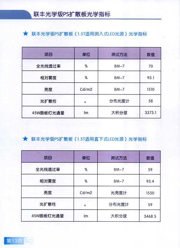 常州市聯(lián)豐(鏡面輥)集團(tuán)成立于2000年,是國(guó)內(nèi)從事板片材行業(yè)輥筒制造的專業(yè)企業(yè)。聯(lián)豐集團(tuán)全資子公司常州市聯(lián)豐光電科技有限公司成立于2013年6月。聯(lián)豐光電專業(yè)從事光學(xué)級(jí)擴(kuò)散板的研發(fā),生產(chǎn)和銷售。擁有各類高級(jí)技術(shù)研發(fā)人員10人,生產(chǎn)、管理及銷售人員60人。公司廠房占地面積2萬(wàn)平方米,工廠擁有十萬(wàn)級(jí)凈化車間,能有效滿足光學(xué)領(lǐng)域擴(kuò)散板生產(chǎn)的環(huán)境要求。公司已經(jīng)申報(bào)江蘇省高新技術(shù)企業(yè)。 公司現(xiàn)擁有全新進(jìn)口PS專用擴(kuò)散板材生產(chǎn)線兩條,月生產(chǎn)能力650噸PS擴(kuò)散板。日本進(jìn)口協(xié)榮裁切一體機(jī)兩臺(tái),月加工能力50萬(wàn)片(32寸擴(kuò)散板)。 聯(lián)豐生產(chǎn)的VFP系列PS擴(kuò)散板能廣泛應(yīng)用于直下式LED,CCFL液晶電視背光模組。產(chǎn)品在很多國(guó)內(nèi)一線TV的背光模組上使用。產(chǎn)品具有高輝度,高擴(kuò)散性,特別適用于超薄背光模組的擴(kuò)散部件,能有效降低成本,節(jié)約能源。 由于LED照明行業(yè)的興起,公司特別針對(duì)于LED面板燈和筒燈開發(fā)的LFP系列擴(kuò)散板,在滿足透光率條件下,能最大限度提高光通量,從而增加燈具的光效,受到廣大客戶的好評(píng)。