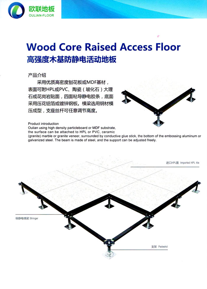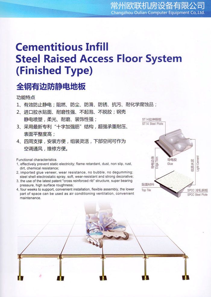 防靜電高架活動地板、全鋼地板、陶瓷地板是計算機行業(yè)發(fā)展起來的新型鋪地材料,隔離了潮氣、靜電灰塵,最重要的是解決了綜合布線問題,無需預(yù)埋管線,可隨時拆卸、搬移,保證了資訊設(shè)備完整的優(yōu)點,適應(yīng)了智能化樓宇中信息自動化技術(shù)對所處環(huán)境的特定要求,避免了廣大客戶的雙重投資,使現(xiàn)代化辦公程度更加高效,辦公場所更加舒適。 “歐聯(lián)”系列全鋼地板,符合國家安全要求,種類完備多樣,其中防靜電陶瓷地板、硫酸鈣地板等除具有普通瓷質(zhì)的裝飾和實用性外,其耐磨、防水、防火功能優(yōu)于其它同類產(chǎn)品,防靜電系列地板,能切合不同客戶的要求,其靈活的配置,深受客戶歡迎,不同材質(zhì)的地板結(jié)構(gòu)使設(shè)計師的設(shè)計空間比傳統(tǒng)的更加廣闊自由和善變。 公司大力發(fā)展國內(nèi)外銷售業(yè)務(wù),多次中標(biāo)國內(nèi)重點工程 ,例:哈爾濱醫(yī)科大學(xué)、山東大學(xué)、上海普通機場等。 公司將一如既往開發(fā)和制造一流的產(chǎn)品,愿與廣大有識之士合作發(fā)展,共創(chuàng)美好未來。