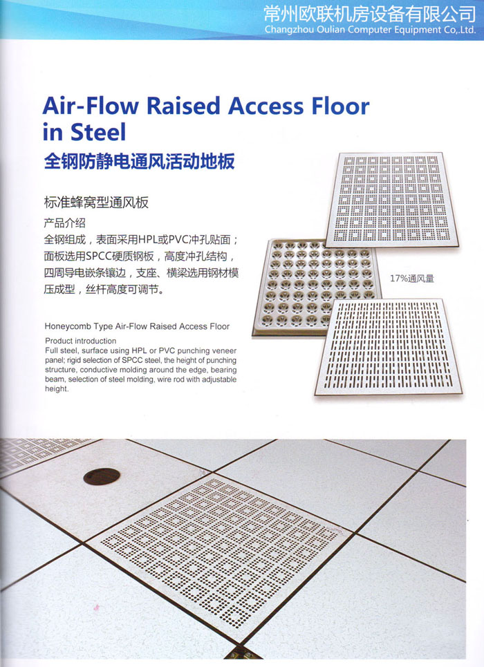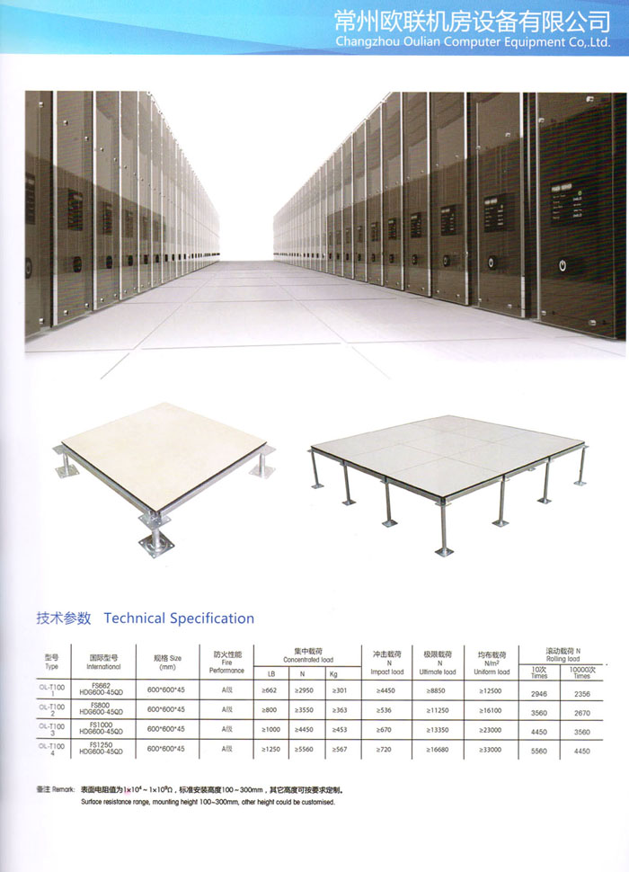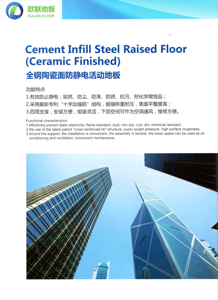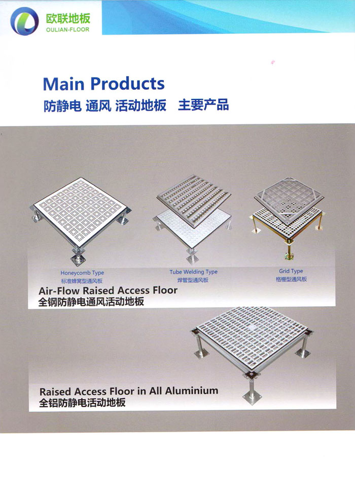 防靜電高架活動(dòng)地板、全鋼地板、陶瓷地板是計(jì)算機(jī)行業(yè)發(fā)展起來(lái)的新型鋪地材料,隔離了潮氣、靜電灰塵,最重要的是解決了綜合布線(xiàn)問(wèn)題,無(wú)需預(yù)埋管線(xiàn),可隨時(shí)拆卸、搬移,保證了資訊設(shè)備完整的優(yōu)點(diǎn),適應(yīng)了智能化樓宇中信息自動(dòng)化技術(shù)對(duì)所處環(huán)境的特定要求,避免了廣大客戶(hù)的雙重投資,使現(xiàn)代化辦公程度更加高效,辦公場(chǎng)所更加舒適。 “歐聯(lián)”系列全鋼地板,符合國(guó)家安全要求,種類(lèi)完備多樣,其中防靜電陶瓷地板、硫酸鈣地板等除具有普通瓷質(zhì)的裝飾和實(shí)用性外,其耐磨、防水、防火功能優(yōu)于其它同類(lèi)產(chǎn)品,防靜電系列地板,能切合不同客戶(hù)的要求,其靈活的配置,深受客戶(hù)歡迎,不同材質(zhì)的地板結(jié)構(gòu)使設(shè)計(jì)師的設(shè)計(jì)空間比傳統(tǒng)的更加廣闊自由和善變。 公司大力發(fā)展國(guó)內(nèi)外銷(xiāo)售業(yè)務(wù),多次中標(biāo)國(guó)內(nèi)重點(diǎn)工程 ,例:哈爾濱醫(yī)科大學(xué)、山東大學(xué)、上海普通機(jī)場(chǎng)等。 公司將一如既往開(kāi)發(fā)和制造一流的產(chǎn)品,愿與廣大有識(shí)之士合作發(fā)展,共創(chuàng)美好未來(lái)。