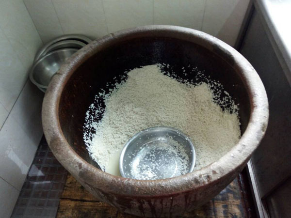 第二步:冷卻降溫,糯米蒸熟后,用冷水淋沐,直至糯米飯溫度降到35℃左右。要知道這個(gè)溫度非常關(guān)鍵,太冷了會(huì)影響之后酒曲發(fā)酵,溫度太高會(huì)把酒曲中的酵母殺死。不靠溫度計(jì),老徐靠得完全是自己多年的經(jīng)驗(yàn)。