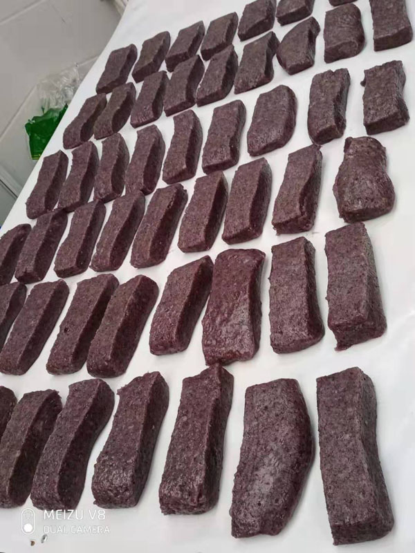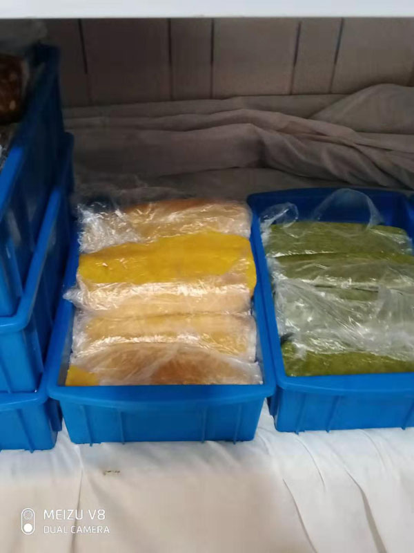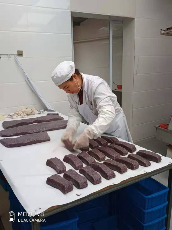 腳踏糕本名“年糕”,按常州周邊地區(qū)的風(fēng)俗習(xí)慣,在春季前夕,各家各戶都要蒸年糕,吃年糕!案狻敝C音“高”,過年吃年糕被賜予“年年高”,一年高一年,鋒吉祥之意,表達(dá)這人們對(duì)未來美好生活的憧憬和良好的祝愿。今天小編要帶大家的就是一家至今保持著傳統(tǒng)手工制作的鈺鋒糕點(diǎn)坊。   鈺鋒糕點(diǎn)坊位于常州鄭陸鎮(zhèn)三皇廟范家莊,一個(gè)比較偏僻的村莊,雖然這家作坊不大,但香糯絲滑,軟糯適中,韌勁十足的腳踏糕吸引了無數(shù)的食客。制作一條腳踏糕要從淘米,浸泡,碾粉,鋪粉,一層一層的鋪下去,需要無數(shù)道制作工序,這些都是店主孫煥公公老周,憑著幾十年的經(jīng)驗(yàn),加上店主孫煥從不馬虎的決心!   這“腳踏”也并非赤腳上陣,而是把蒸好的糕倒入早以準(zhǔn)備好的框子里,用布包裹好,上面再用薄膜包好,再蓋上布,再換上專門腳踏的布鞋,踩的時(shí)候要?jiǎng)蚍Q,左右腳要配合好,不然糕會(huì)高高低低,不平整,最后再拿蠟燭線拆成一條小長(zhǎng)條,再拿帶包裝好,如此又香又糯的腳踏糕就大功告成了。   店主孫煥為了讓更多的人認(rèn)識(shí)和了解常州腳踏糕的傳統(tǒng)文化和美食,她在傳統(tǒng)工藝中增加了適合現(xiàn)代文化的多種口味,她在糕里加入南瓜,紫薯,老紅糖,大麥汁,血糯米,核桃,葡萄干,紅棗等食材,做出五顏六色,純天然的口味,深受食客們的喜愛,不管是送人還是自己吃都非常新穎。