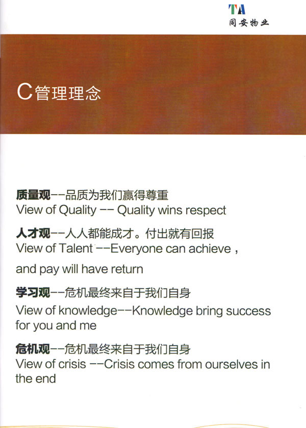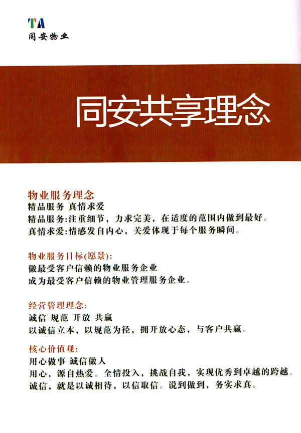 公司始終以“打造中國(guó)最值得信賴和最值得尊重的物業(yè)管理服務(wù)集成商”為愿景自我鞭策,不斷前行。同安物業(yè)以客戶滿意為終極目標(biāo),不斷加強(qiáng)”崗位資格認(rèn)證能力,人才招聘與職業(yè)化培訓(xùn)能力,產(chǎn)品策劃與管理設(shè)計(jì)能力,品質(zhì)監(jiān)督與管控能力,技術(shù)更新與運(yùn)營(yíng)優(yōu)化力“五大專業(yè)能力的培養(yǎng)和提升,實(shí)現(xiàn)“精品化管理,專業(yè)化服務(wù)”。