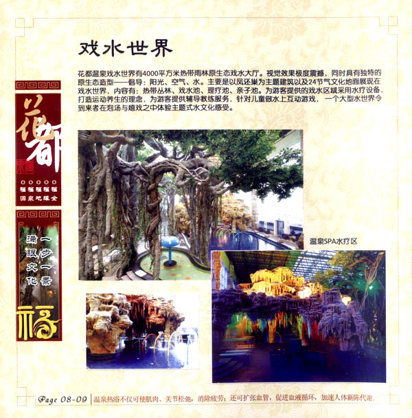 花都溫泉水城包括洗浴區(qū)、戲水世界、露天溫泉、自助餐廳、生態(tài)房、別墅區(qū)、紅文化房、VIP區(qū)等多種功能區(qū)域,是集溫泉養(yǎng)生、休閑住宿、演藝會務(wù)為—體的休閑度假勝地,給賓客帶來江南小鎮(zhèn)的浪漫水城之旅。